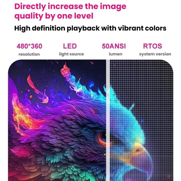 1. Chip: D3101/D3100 2. Light source type: LED 3. Lumen: 50ANSI 4. Resolution: 480 x 360 5. Projection size: 15 inches - 80 inches 6. Keystone correction: electronic keystone 7. Focus technology: manual focus 8. System version: RTOS 9. Speaker: 4 ohm 2W 10. Power consumption: 10W 11. Voice selection: English by default, more than 24 languages can be selected, including Chinese, Russian, Korean, Japanese, etc. 12. HDMI interface: connect to computer, set-top box, game console, etc. 13. Accessories: User manual, remote control (powered by 2 AAA batteries, batteries are not included in shipment), power cord, power adapter 14. Net weight: about 285g