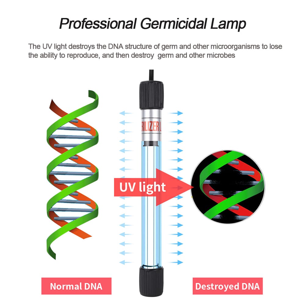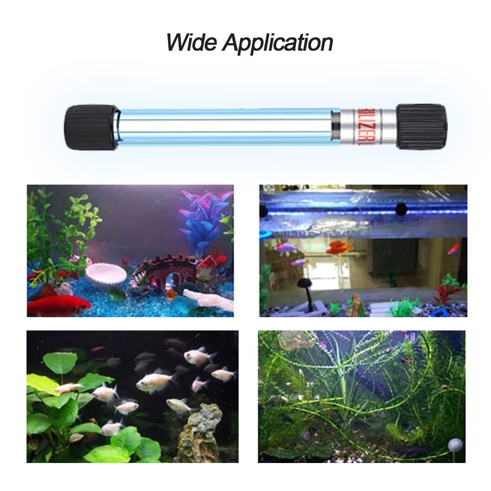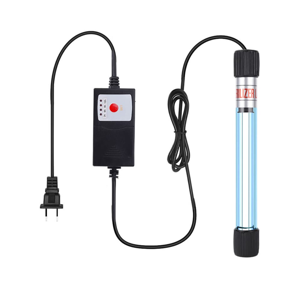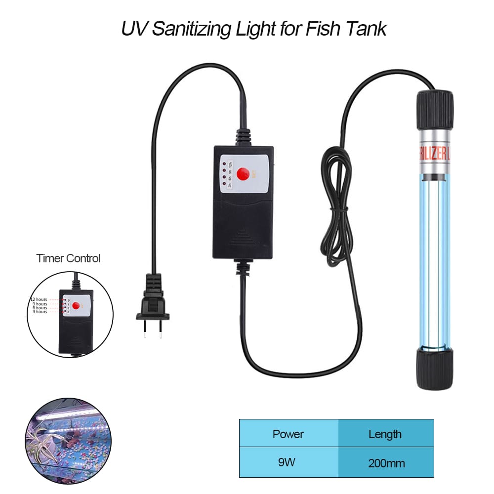 This UV light with a timer canpurify the water quality of the fish tank and inhibit harmful bacteria to grow in water the UV lights work effectively in preventing fish from health problems at the root.With 4 intelligent timing modes of 3h/6h/9h/12h it can automatically switch on and off to meet the needs of sterilization in different periods.Features:?Professional Germicidal Lamp: The UV light destroys the DNA structure of germ and other microorganisms to lose the ability to reproduce and then destroy germ and other microbes. It can do algae removal sterilization and deodorization.?Help to Keep Fishes Health: By purifying the water quality of the fish tank and inhibit harmful bacteria to grow in water the UV lights work effectively in preventing fish from health problems at the root.?Timer Mode: With 4 intelligent timing modes of 3h/6h/9h/12h it can automatically switch on and off to meet the needs of sterilization in different periods. It is allowed to automatically shuts off after 3 hours/6 hours/9 hours/12 hours and automatically turn on after 21 hours/18 hours/15 hours/12 hours correspondingly.?Explosion-proof: Made of high-quality glass the light is strong sealing not easy to burst and safe to use with good light transmission.?Safety: No chemical residue in ultraviolet irradiation will not damage any materials. You can make sure that your fishes live in a clean environment.?After-sale Guarantee: Any problem please contact our store without hesitation. Honor to serve you!Specifications:Item name: UV Sanitizing LightMain material: GlassLight color: BlueTimer Mode: 3h/6h/9h/12hRated power: 5W/7W/9W/11WWorking voltage: 220V(EU); 110V(US)Suitable tank:5W: up to 50cm-long; 7W: up to 90cm-long; 9W: up to 120cm-long; 11W: up to 200cm-longItem Length: 5W: 175mm; 7W: 175mm; 9W: 200mm; 11w: 235mmWire Length: 0.9mPackage Information:Package size: 5W/7W Light: 200g; 9W/11W: 220gPackage weight: 26 * 8 * 4.5cmGeneral box packing.Note:* There could be a few deviations due to manual measurement or slight color difference owing to photographing condition. Thank you for your understanding.Packing List:1 * UV Light