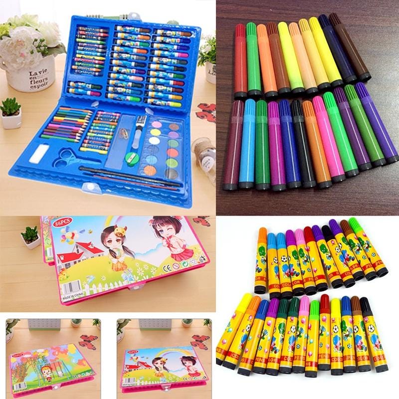 Model Number:T8908 Color:Blue Pink Dimensions length: 33.1cm, height: 22cm, thickness 3.2cm Weight: 0.48kg Internal structure: This product is suitable for children over 3 years old, in accordance with ASTM D4236 inspection standard This paragraph contains 24 watercolor pens, 12 color crayons, 12 color waxStick, 12-color pencil, 12-color pigment, 1 ruler, 1 pencil, 1 eraser, 1Pencil sharpener, 1 plastic scissors, 1 paint brush, 1 paint tray, 1 sea Cotton, 6 paper clips Note: The cap must be closed when not in use to extend the service life.