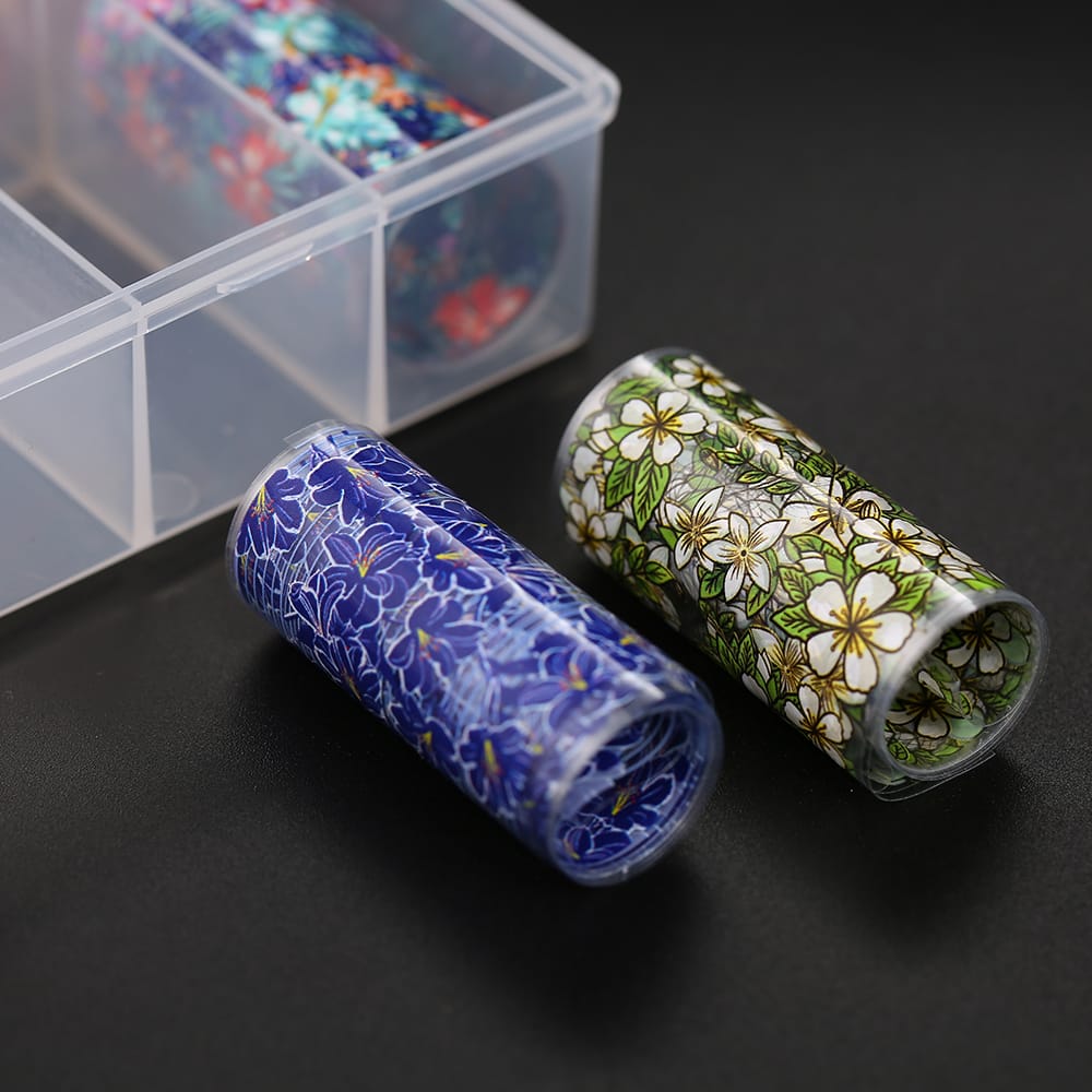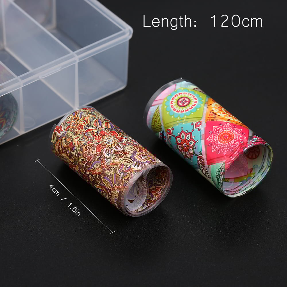 Features:Made of environmentally friendly material non-toxic No painting no heating required.The foil sticker set have different color and patterns allow you to design your nails freely.Can be easily removed with nail polish remover change the pattern any time.Easy to apply on all kinds of nail styles Just press the foil on nails after applying colored polish just a few seconds we can get the fine nail art design.10 Rolls nail foil transfer stickers come with a storage box with separate storage space easy to store and carry.Specification:Type: Nail Foil StickersModel: TZ-01 TZ-02 TZ-03 (Optional)Size: 120cm(length) * 4cm(width)Quantity: 10 Rolls/boxPackage Size: Approx. 12 * 10 * 3cm / 4.7 * 3.9 * 1.2inPackage Weight: Approx. 75g / 2.6ozPackage List:1 * Set Nail Foil Stickers