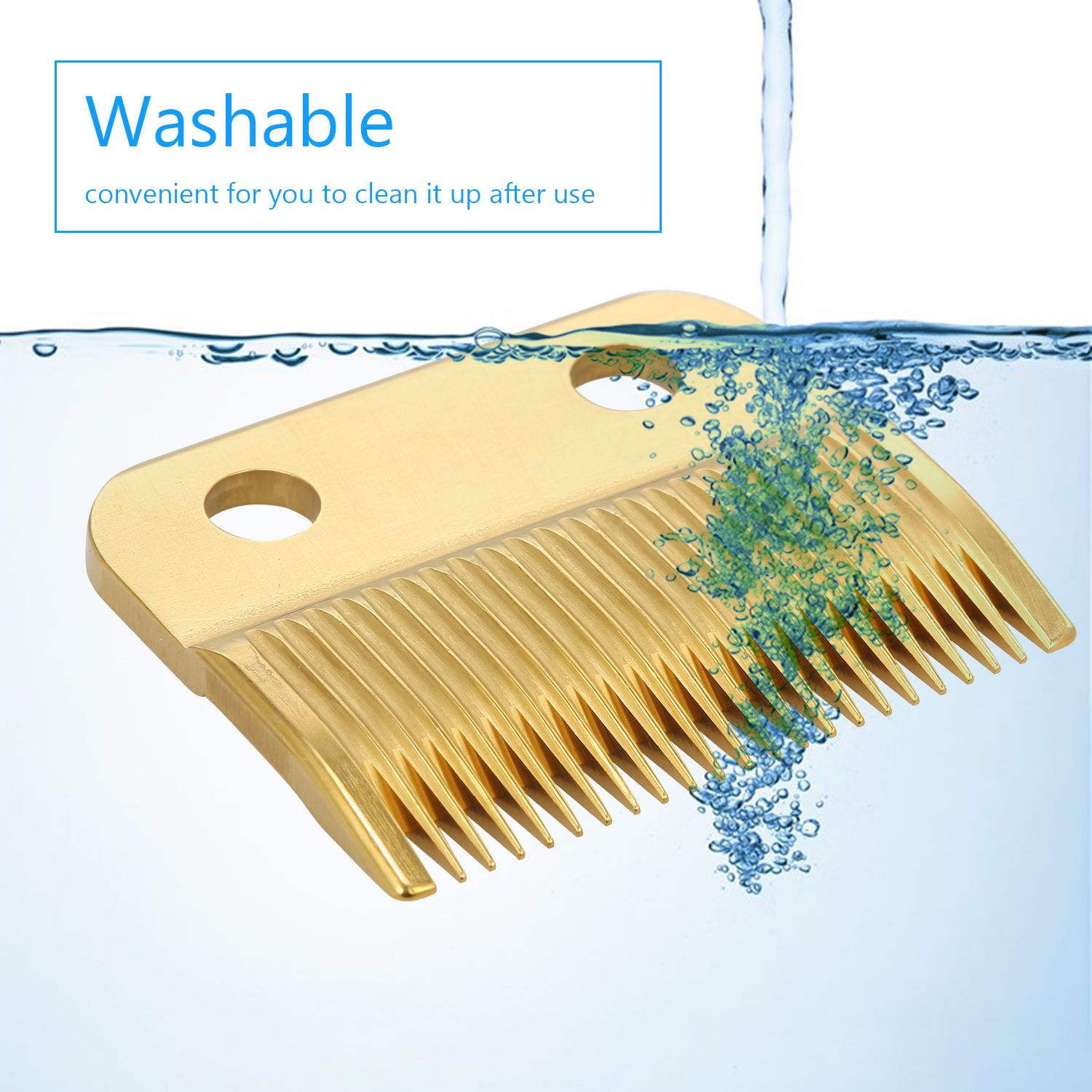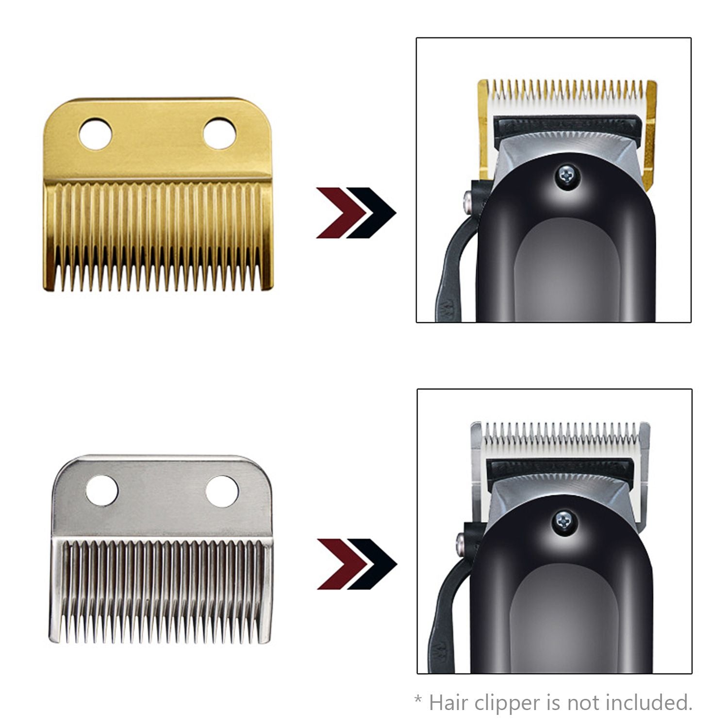 Description:Reliable quality it will perfectly fit your hair clipper! Come and have a look.Features:Nice for home and salon use.It runs smoothly and very efficiently.A great replacement blade for your hair clipper.Washable convenient for you to clean it up after use.Electroplated stainless steel material sturdy and durable.Specifications:Type: Hair Salon ToolMaterial: Stainless SteelColor: Silver Gold (Optional)Quantity: 1PCItem Size: Approx. 4.5 * 3.8cm / 1.77 * 1.5inPackage Size: Approx. 6.8 * 5.3 * 1.2cm / 2.68 * 2.09 * 0.47inPackage Weight: Approx. 38g / 1.34ozPackage List:1 * Clipper Blade