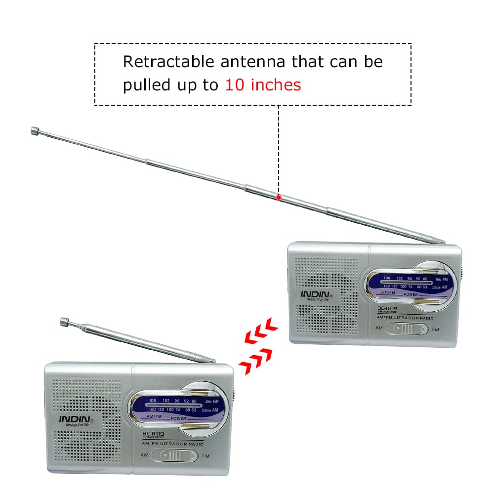 Overview: This is a small mini AM/FM radio with a frequency range of FM: 88-108MHz AM: 530-1600KHz. Easy to carry. The radio signal can be enhanced with a retractable antenna. With a standard 3.5mm headphones jack setting and built-in speakers you can easily listen to your favorite channels.Features:*This radio frequency can be adjusted AM/FM dual-band speaker among which FM: 88-108MHz AM: 530-1600KHz you can easily listen to your favorite channels.*The radio has a retractable antenna that can be pulled up to 10 inches and manually adjusts the signal of the radio to enhance signal acceptance.*The radio is equipped with high-performance built-in speakers for easy audio playback.*With a 3.5mm headphone jack you can choose to plug in headphones for listening or use the speakers.*It is compact easy to carry lightweight with a wrist strap design that you can put in your pocket or hang anywhere to prevent it from falling off.Specifications:Name: INDIN Mini RadioModel Number: BC-R119Color: Silver greyType: AM / FMSpeaker: Built-in speakerMaterial: PlasticFrequency range: FM: 88-108MHz AM: 530-1600 KHzPower: 2 * AA batteries (Battery not Included)Item size: 91 * 56 * 23mm / 3.58 * 2.2 * 0.91inItem weight: 61g / 2.15ouncePackage size: 105 * 65 * 28mm / 4.13 * 2.56 * 1.1inPackage weight: 70g / 2.47ouncePackage list:1 * Mini Radio