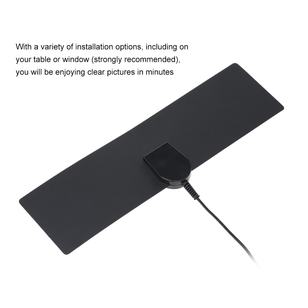 Overview:The product is the best amplified indoor HDTV antenna to receive signals. It is compatible with 720p 1080i 1080p. And the frequency range is UHF 470-862MHz.Features:HD / UHF / FM flat indoor antenna. HDTV 1080P 1080i 720P support.The product is as light as a feather and it allows you to place it anywhere without affecting the interior.With a variety of installation options including on your table or window (strongly recommended) you will be enjoying clear pictures in minutes.Full Band DTV/VHF/UHF ReceiverUHF Frequency Range 470-860 MHzSpecification:Model: LAN-1061Type: indoor digital TV antennaUHF Frequency Range : 470-860 MHzPolarization: LinearImpedance: 75 OhmsSignal acceptance distance: 30 milesConnector type: F head with IEC adapterGain 5dB (Max)Line length: 10ft coax cable includedSpecially Designed Electronic CircuitryUse: GeneralColor: BlackItem Size: 27.6*7.5cm / 10.9*2.95inItem Weight: 62g / 2.2ozPackage Size: 34.5*24cm / 13.6*9.4inPackage Weight: 67g / 2.4ozPacking List:1 * HDTV Antenna with 10ft Coaxial Cable2 * Foam Sticker1 * Conversion head1 * User Manual