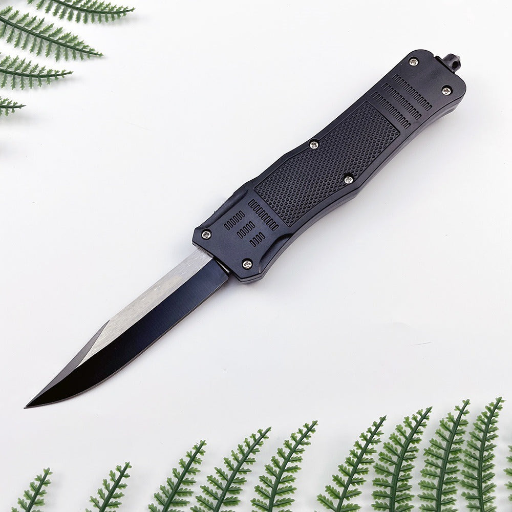 This is the newest spring blade for outdoor use. Unlike traditional frontal pop-up blades the pop up switch is on the side.Made from 440 stainless steel it is more suitable for field survival.Features:Instant pop-up quick response faster protection of the key moment.The black paint of the product makes the product cooler.The material of stainless steel makes the product more suitable for field survival.Unlike traditional frontal pop-up blades the pop up switch is on the side.There are two models for you to choose.Specifications:Type: 1(single edge) 2(double edge) (optional)Color: black camouflage grey (optional)Full length: 230mm / 9.05inBlade length: 90mm / 3.54inBlade land: 2.8mm / 0.11inBlade: 440Hardness: 57HRCSurface: oxidizing blackShank: zinc aluminum alloy + ABSLock: straight out spring bladeItem weight: 90g / 3.17ouncesPackage size: 150 * 38 * 25mm / 5.9 * 1.5 * 0.98inPackage weight: 100g / 3.53ouncesPackage List:1 * Spring Blade
