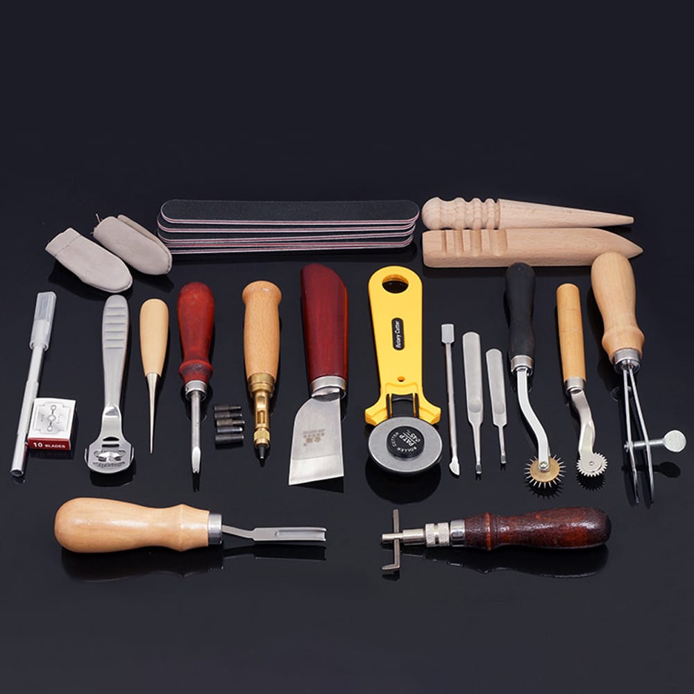 This is a 24pcs leather craft hand tools kit you can sew different leather fabric denim canvas or tarpaulin.Features:Suitable for proficient or novice perfect for sewing leather canvas or other projects.Nice for any custom leather works.Fine gift for clothes designer or housewife.Basic stamping set for beginner perfect for personalizing your leather projects.Specifications:Main material: wood metalPackage size: 210 * 140 * 40mm / 8.3 * 5.5 * 1.6inPackage weight: 830g / 1.8lbPacking List:1 * 95mm Chamfer Machines1 * 115mm Chamfer Machines1 * Log Awl1 * Removable Long Belt1 * 2 mm Pitch Line Wheel1 * 4 mm Pitch Line Wheel1 * Cutting Cutter1 * Cut Thin Blade Set1 * 1 mm Edges Detector1 * Distance Between Blank Holder Device1 * French Shovel Edges Detector1 * Trimming Round Rods1 * Leather Chamfer Device1 * Cutting Cutter1 * Pair of Leather Gloves5 * Polishing Article Yarn1 * Flat Bar1 * Stainless Steel Glue Stick1 * Burin1 * Cloth Cutter