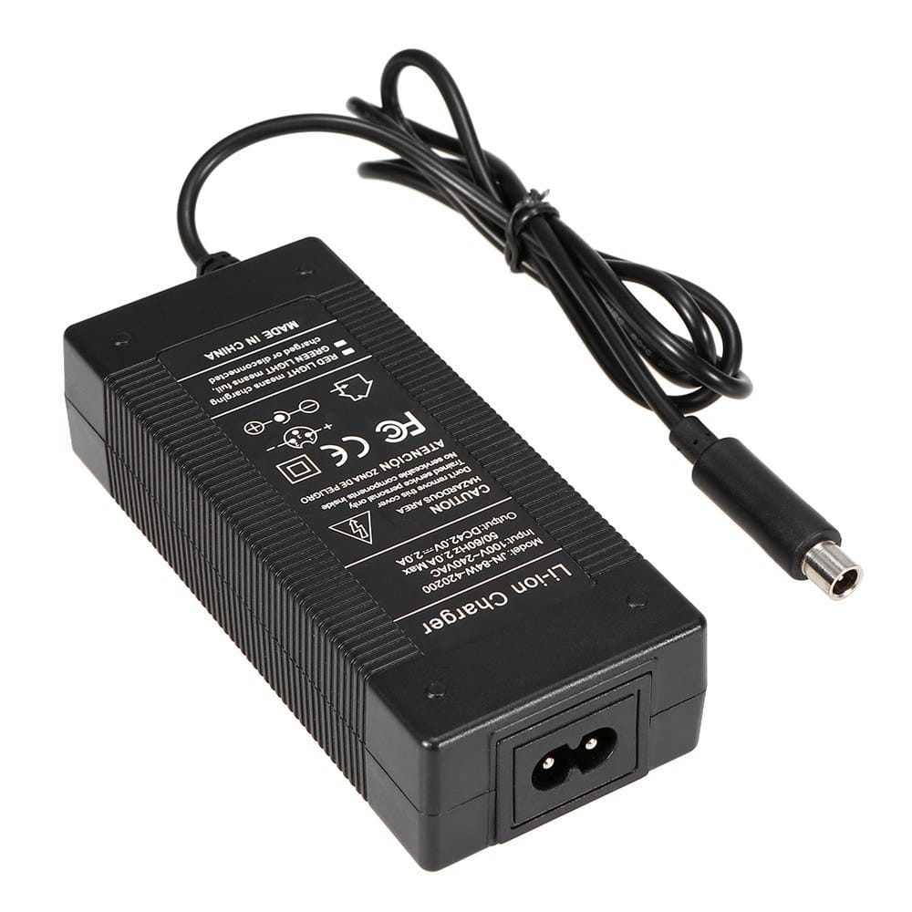 Scooter Charger 42V 2A Charger Compatible with Xiaomi M365Electric Scooter.Features:WIDE APPLICATION: 100% compatibility Fits Xiaomi ScooterMijia M365 Segway Ninebot ES1 ES2 ES4 Bird Lime Lime-S Skip and Spin.HIGH QUALITY: Made of only the highest quality materialsand built to last! Our chargers are guaranteed to match the quality of the brand factory chargers.EASY TO USE: Simply plug the charger into a wall outlet andthen directly into your scooter.OUTPUT: DC 42V 2A.Any problem please contact our store without hesitation.Honor to serve you.Specifications:Item Name: Scooter ChargerMaterial: PlasticInput: AC100-240V 50/60HZOutput: DC42.0V 2.0AWire Length: 95cmConnector Wire Length: 118cmPackage Information:Package Size: 15 * 13 * 5cmPackage Weight: 260gPackage List:1 * Charger1 * Connecting Cable with Plug