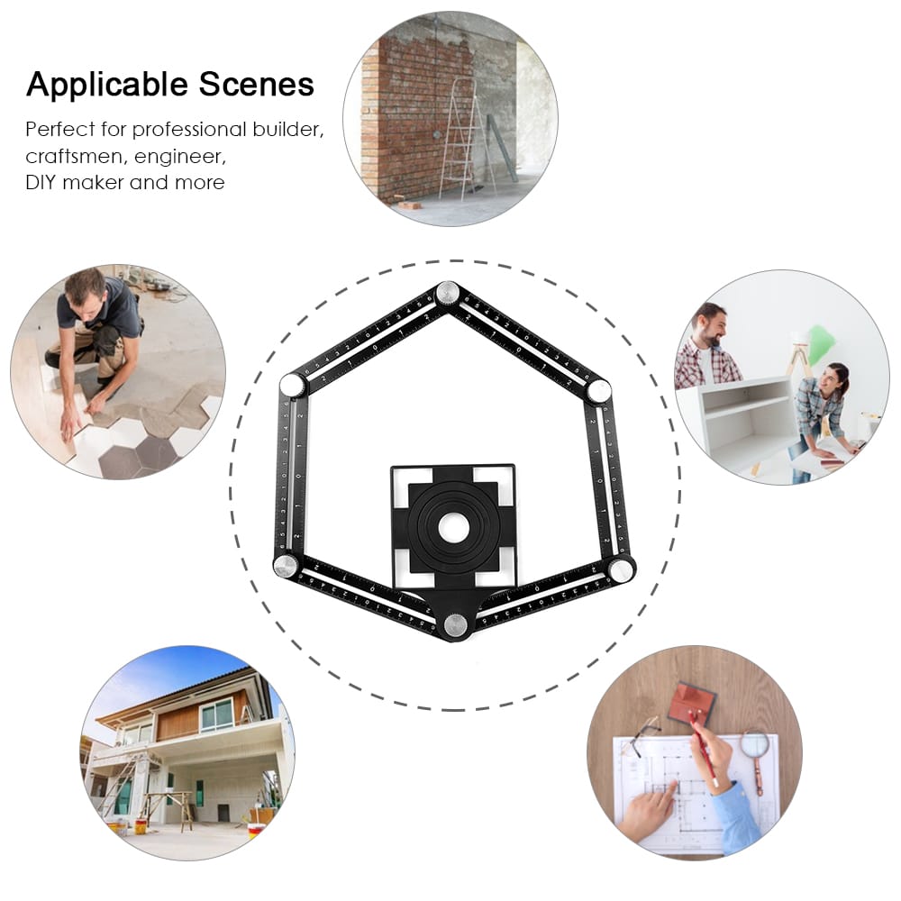 With 6-sided angle measuring tool you can create a custom stencil for your job by simply sliding the rulers into the shape you need and then measure it. Use it to mark tile flooring bricks lumber laminate metal and more!Features:?Custom Stencil?Create a custom stencil for your job slide and lock into any desired angles to save you time on repetitive measurements.?Wide Application?Multi angle measuring tool can be traced onto any materials. Use it to mark tile flooring bricks lumber laminate metal and more.?Easy to Use?Just place onto your work area slide the rulers into the shape you need and tighten the screws. Perfect for professional builder craftsmen engineer and DIY.?Premium Quality?Premium aluminum alloy material durable anti-scratch anti-bend and anti-corrosion. All-metal knobs sturdy and durable than plastic ones.?Laser Etched Scale?Laser engraved markings of inches and centimeters clearer and more precise than the painting markings perfect for precise and accurate angle.Specifications:Color: BlackMain Material: Aluminum Alloy + PlasticMaximum Scale: 12cm or 5.0inApplication: Mark tile flooring bricks lumber laminate metal and morePackage Size: 17 * 12 * 2cm / 6.7 * 4.7 * 0.8inPackage Weight: 207g / 7.3ozPackage List:1 * Universal Ruler