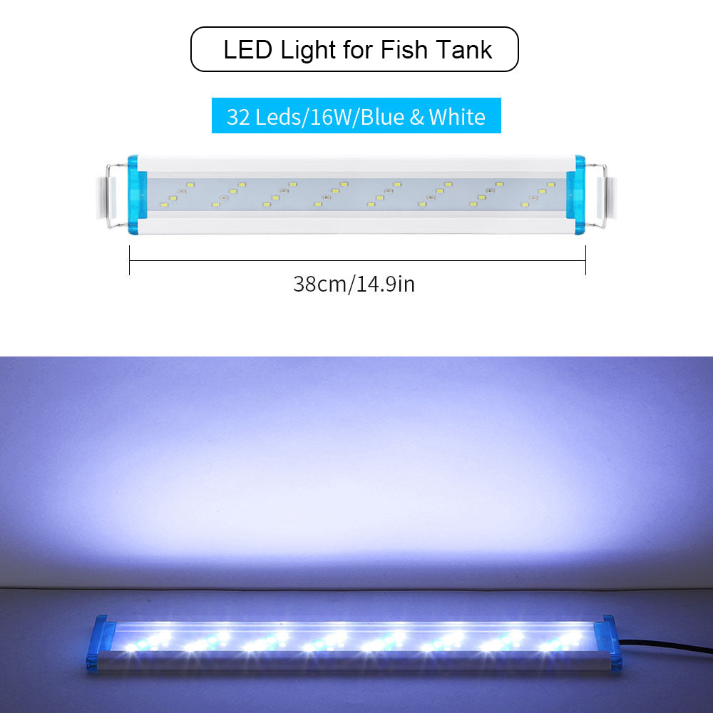 This LED Light with blue and white light is designed for a fish tank and planted tank. It is completely suitable for the growth of aquatic plants and gives you a beautiful aquarium landscape.With the expandable mounting bracket it can be stretched up to 13cm for easy installation and fixation.It is ideal for freshwater or saltwater fish and low-to-high light level aquarium plants; Suitable for coral reef coral and fish breeding.Feature:? Night Lighting: The light for the fish tank can illuminate pure white light and cool blue light which is completely suitable for the growth of aquatic plants and gives you a beautiful aquarium landscape.? Safety: The high-brightness 5730 lamp beads and the safe working voltage make the light will not cause any danger to people or fish. It is reliable and durable.? Retractable: The adjustable mounting bracket can be stretched up to 13cm/5.12in for easy installation and fixation. Lights of various lengths are optional to suit the size of different aquariums.? Beneficial: Ideal for freshwater or saltwater fish and low-to-high light level aquarium plants; Suitable for coral reef coral and fish breeding.? After-sales Service Guarantee: Any problem please contact our store without hesitation. Honor to serve you!Specifications:Item name: Led Light for fish tankMain material: PVCLED Color: White BlueLED Quantity: S: 16LEDS(4 Blue); M: 24LEDS(6 Blue); L: 32LEDS(8 Blue); XL: 40LEDS(10 Blue); XXL: 48LEDS(12 Blue)LED Bead: 5730Working Voltage: 90-260VRated Power: S: 8W; M: 12W; L: 16W; XL: 20W; L: 24WRetractable length: up to 13cm/5.12inFixed part length S: 18cm/7.09in; M: 28cm/11.02in; L: 38cm/14.96in; XL: 48cm/18.9in; XXL: 58cm/22.83inPackage Information:Package size: S: 18.8*7.8*5cm; M: 28.8*7.8*5cm; L: 38.8*7.8*5cm; XL: 48.8*7.8*5cm; XXL: 58.8*7.8*5cmPackage weight: S: 200g; M: 300g; L: 350g; XL: 450g; XXL: 500gGeneral box packing.Note:* There could be a few deviations due to manual measurement or slight color difference owing to photographing condition. Thank you for your understanding.Packing List:1 * Led Light