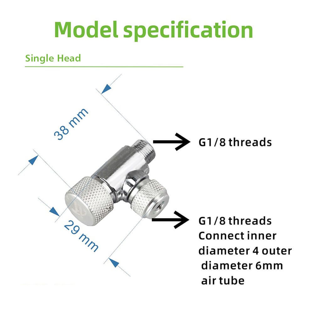 The fine adjusting valve is used for adjust the amount of carbon dioxide finely this valve with high adjustment fineness there is no air leakage under the high pressure system. Single head and double head optional keeping your aquatic plants healthy more convenient and save energy.Features:DURABLE AND EASY TO INSTALL: Be made of aluminum alloy and copper material strong and sturdy. Also easy to install and disassemble.FINE-TUNING THE VOLUME OF CO2: With precise structure to release CO2 by fine tuning so that better supply suitable CO2 for water plants.2 TYPE OPTIONAL: Single head fine adjusting valve one end fits for G1/8 interface the other end connect to the 6*4mm(inner diameter 4mm outer diameter 6mm) air pipe the nut is for fixing the air pipe prevent the air pipe from collapsing; Double head fine adjusting valve 2 end fit for the 4*6mm pipe (inner diameter 4mm and outer diameter 6mm) the nuts are for fixing the air pipe prevent the air pipe from collapsing.FINE WORKMANSHIP: This item is different from the cheap plastic fine adjusting valve the adjustment fineness is high and there is no air leakage under the high pressure system.Specification:Name: Fine adjusting valveColor: SilverMain material: Aluminum alloy+copperOptional type: Single head/double headSize:Single head: 38*29mmDouble head: 43*29mmPackage Information:Package size: 12.3*7.9*3cmPackage weight: 55g; 59gPlastic PackagingPackage List:1* Fine adjusting valve