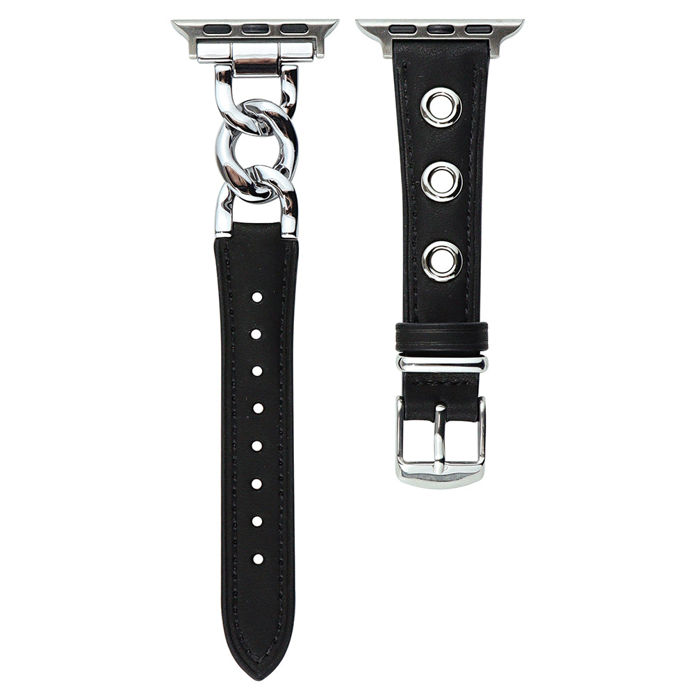For Apple Watch Series 8 7 41mm / 6 5 4 SE SE (2022) 40mm / 3 2 1 38mm AW Watch Band Genuine Cow Leather Chain Hole Strap - Black+Silver Buckle