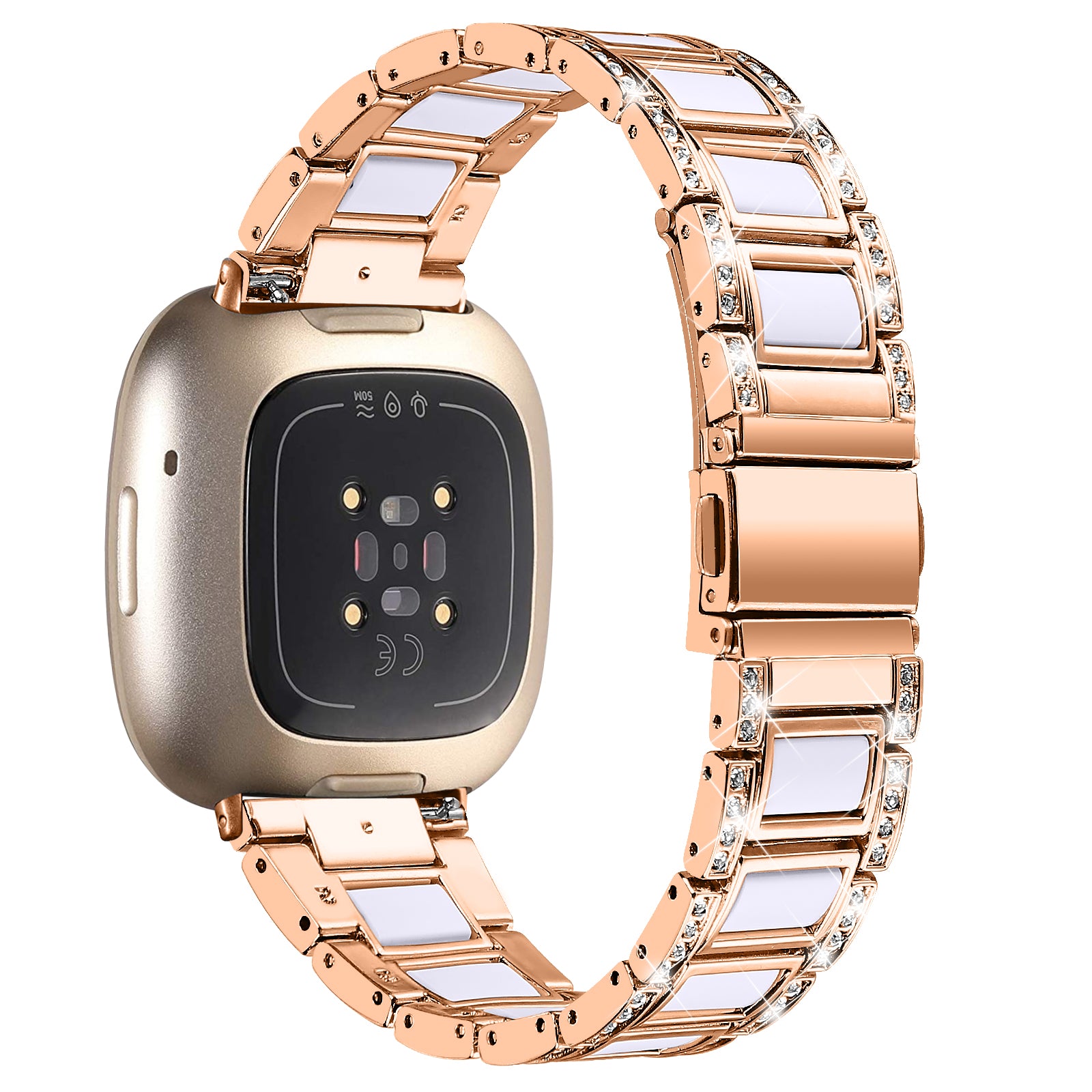 For Fitbit Versa 3 / Sense Stainless Steel Resin Smart Watch Band Replacement Rhinestone Decor Fashionable Wrist Strap - Rose Gold / White