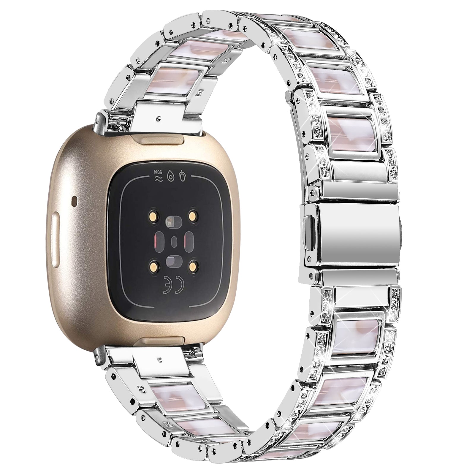For Fitbit Versa 3/Sense Stainless Steel Resin Watch Band Stylish Rhinestone Decor Wrist Strap Replacement - Silver/Pink Mix