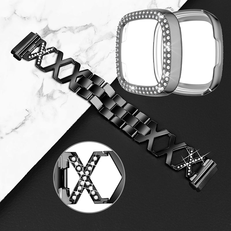 For Fitbit Versa 3 / Sense X-Shape Design Stainless Steel Bracelet Replacement Strap + Two Row Rhinestones Grey Watch Protective Case - Black