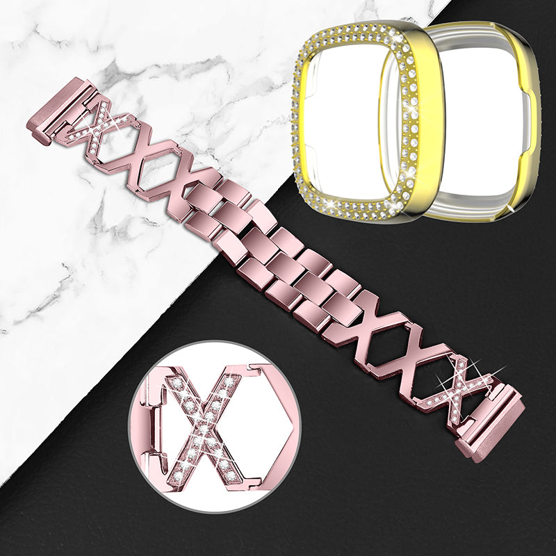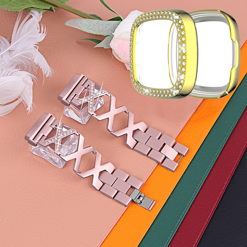 For Fitbit Versa 3 / Sense X-Shape Design Stainless Steel Bracelet Stylish Wrist Band + Two Row Rhinestones Gold Watch Case - Rose Pink