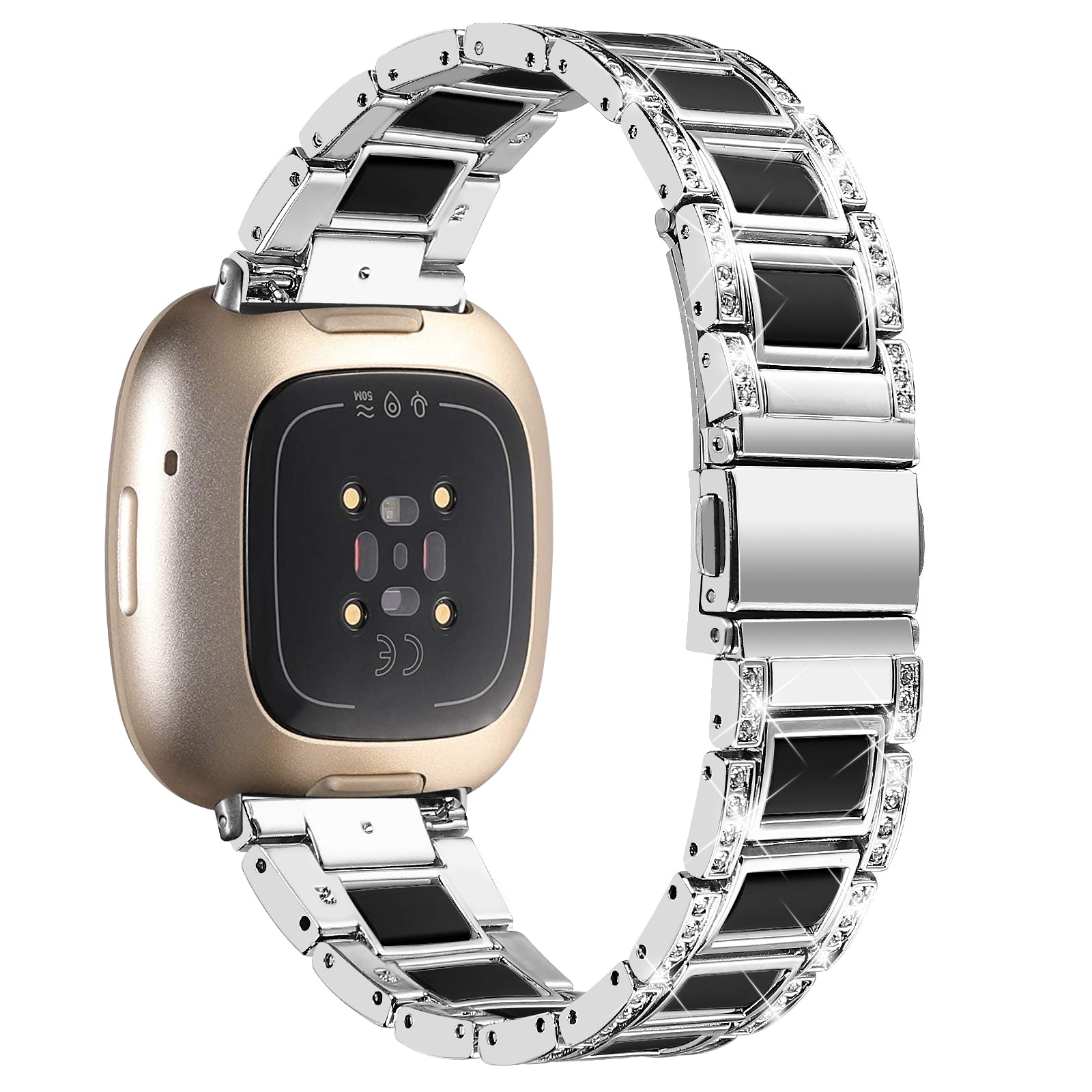 For Fitbit Versa 4 / Sense 2 Watch Band Stainless Steel Resin Strap Rhinestone Decor Bracelet - Silver / Black