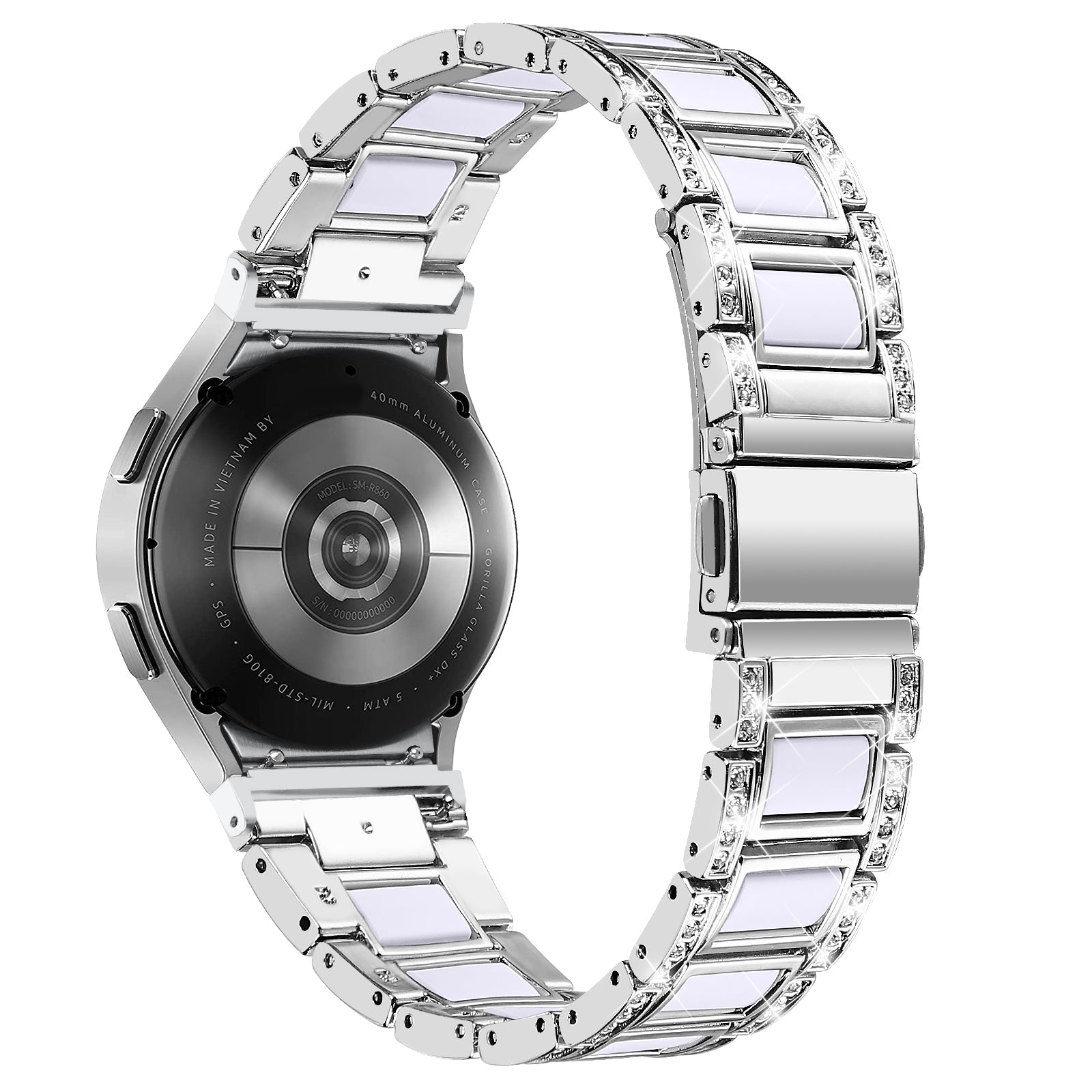 For Samsung Galaxy Watch4 Active 40mm/44mm/Watch4 Classic 42mm/46mm Shiny Rhinestone Watch Strap Stainless Steel Resin Wrist Band Replacement - Silver/White