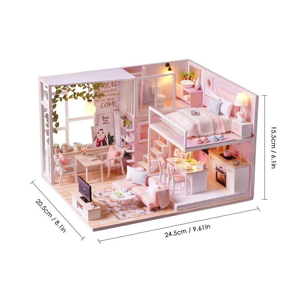 description":"If you are looking for pleasure or you are enthusiast of crafts and miniatures, you can not miss this DIY miniature dollhouse! It uses quite realistic furniture, household supplies, home decorations, plants and many other parts to create a mini house. You can use it as a room decoration after finishing. Features: DIY miniature pink dollhouse with quite realistic furniture, household supplies, home decorations, electric appliance, etc. Made of good material, the parts are precisely cut to correctly fit together. Comes with 5 LED lights and a battery box, after turning on the lights, it will look more attractive. Excellent toys for kids to inspire their thinking, encourage their hand to eye coordination and cultivate their patience. Suitable for people over eight. Perfect gift for Valentine's Day, Children's Day, Christmas, Thanksgiving Day, Birthday, etc. English manual with detailed and colored pictures will guide you how to do step by step. Note: 1. This product only includes the parts, need to be assembled by youelf. 2. The installation tools, glue or batteries are not included, you need to prepare them by youelf. 3. This product doesn't include protective cover. Specifications: Material:resin + plastic + wood + fabric Battery: 2 * 1.5V AAA batteries (not included) Finished Size: 24.5 * 20.5 * 15.5cm / 9.6 * 8.1 * 6.1in Package Size: 30 * 23.5 * 7.5cm / 11.8 * 9.3 * 3in Package Weight: 978g / 34.5oz Package List: 1 * Miniature Dollhouse 1 * Instruction Manual(English)