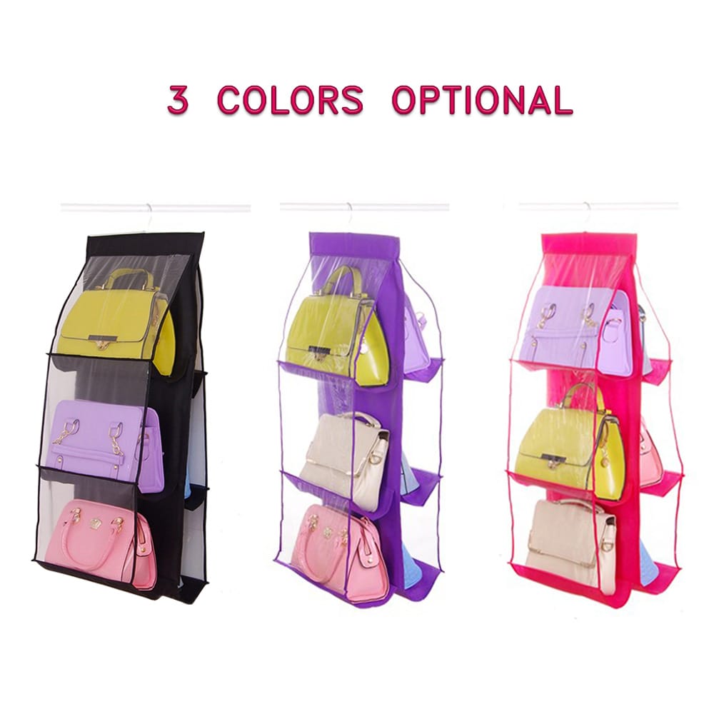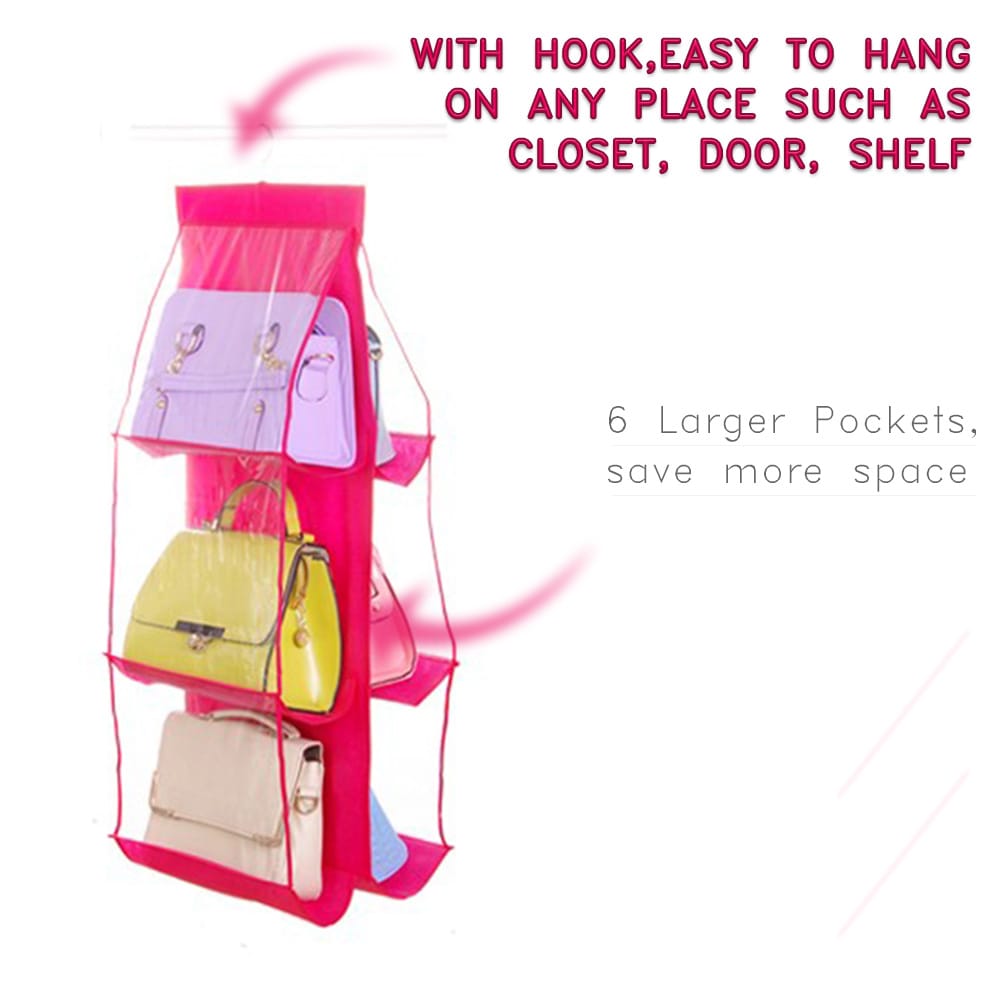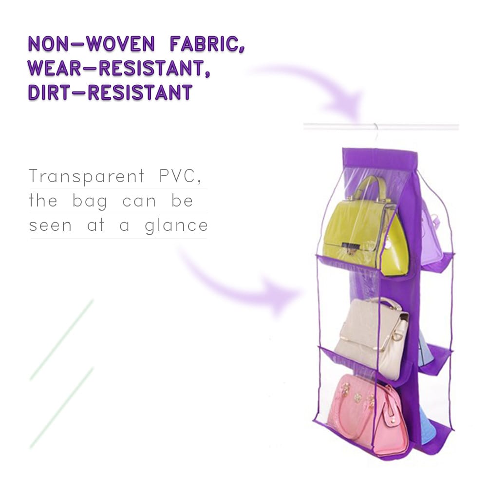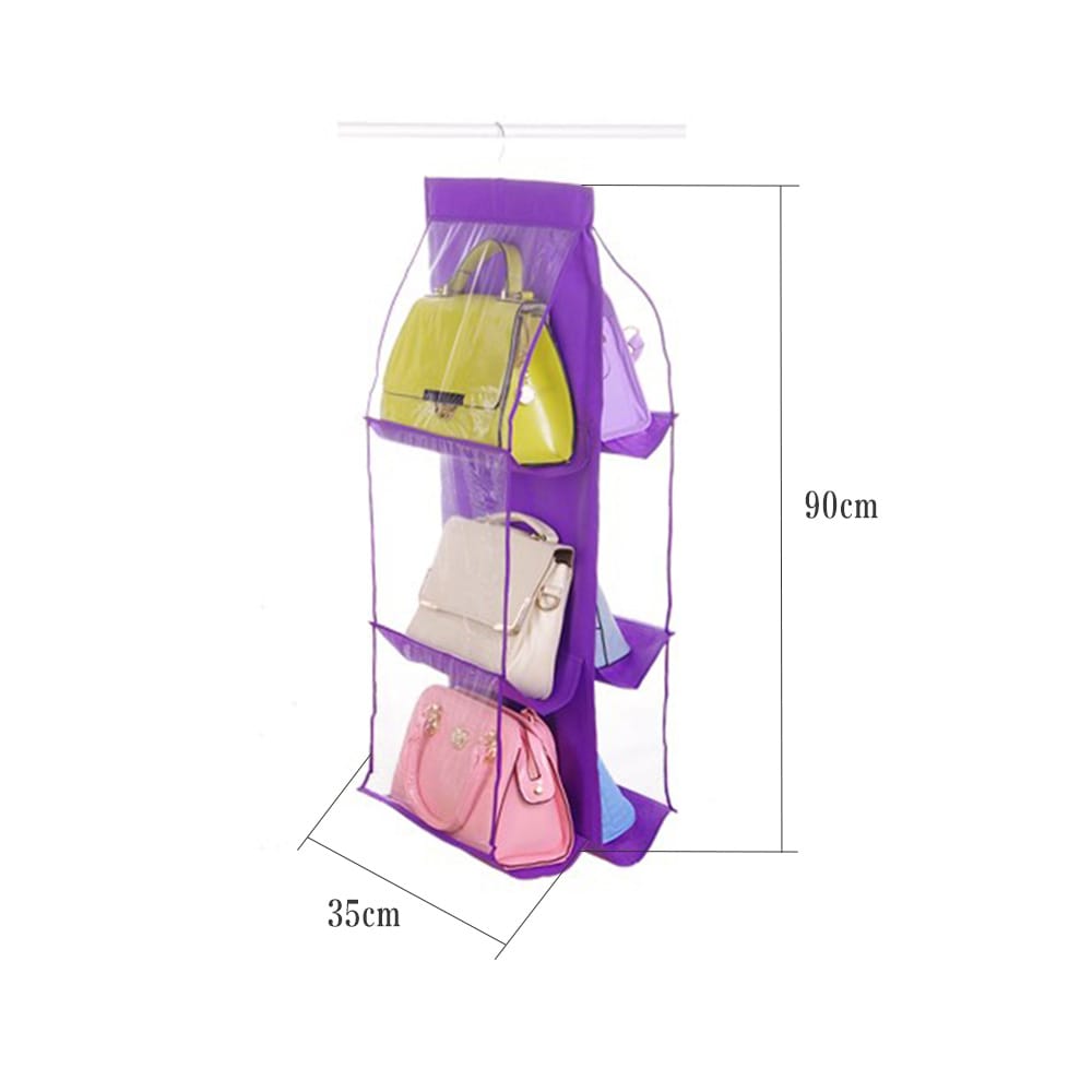 Thepurse bag storage holder is made ofnon-woven fabric and PVC with6 compartments helps to store your bags save your space andwith a hook easy to hang on any place.Features:[High-quality Material]: Purse bag storage holder is made of non-woven fabric and PVC wear-resistant dirt-resistant and high quality.[Save More Space]: It can store your bag well and can display your wallet perfectly. With 6 compartments save your space.[Transparent Design]: You can see the bag you put clearly and the bag can be seen at a glance.[With Hook]: Easy to hang on any place such as closet door shelf. Suitable for bedroom living room hallway or linen cabinet wardrobe.[Warranty]: If there are any problems please contact our store in time. We will give you a satisfactory solution.Specifications:Item: Purse bag storage holderMain material: Non-woven fabric + PVCOptional color: Pink black purpleSize: 35*90cmNote:* There could be some deviations due to manual measurement or slight color difference owing to photographing condition. Thank you for your understanding.Package Information:Package size: 35.5*15*1.5cmPackage weight: 140gPlastic packagePacking List:1* Purse bag storage holder