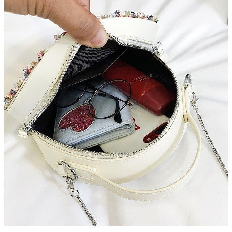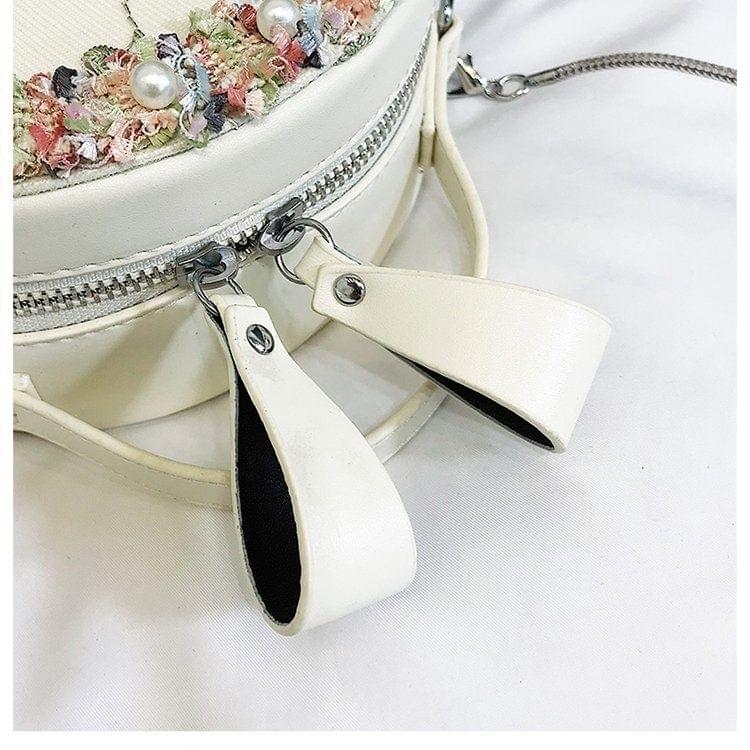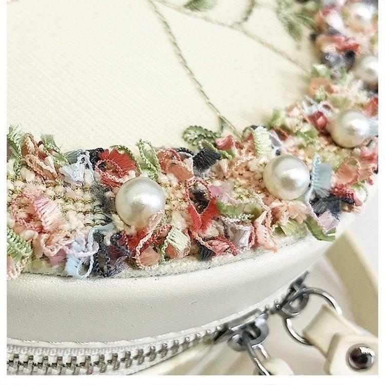 Retro Style Lace Pearl Casual Shoulder Bag Messenger Bag Ladies Handbag Small Round Shoulder Bag (White)
