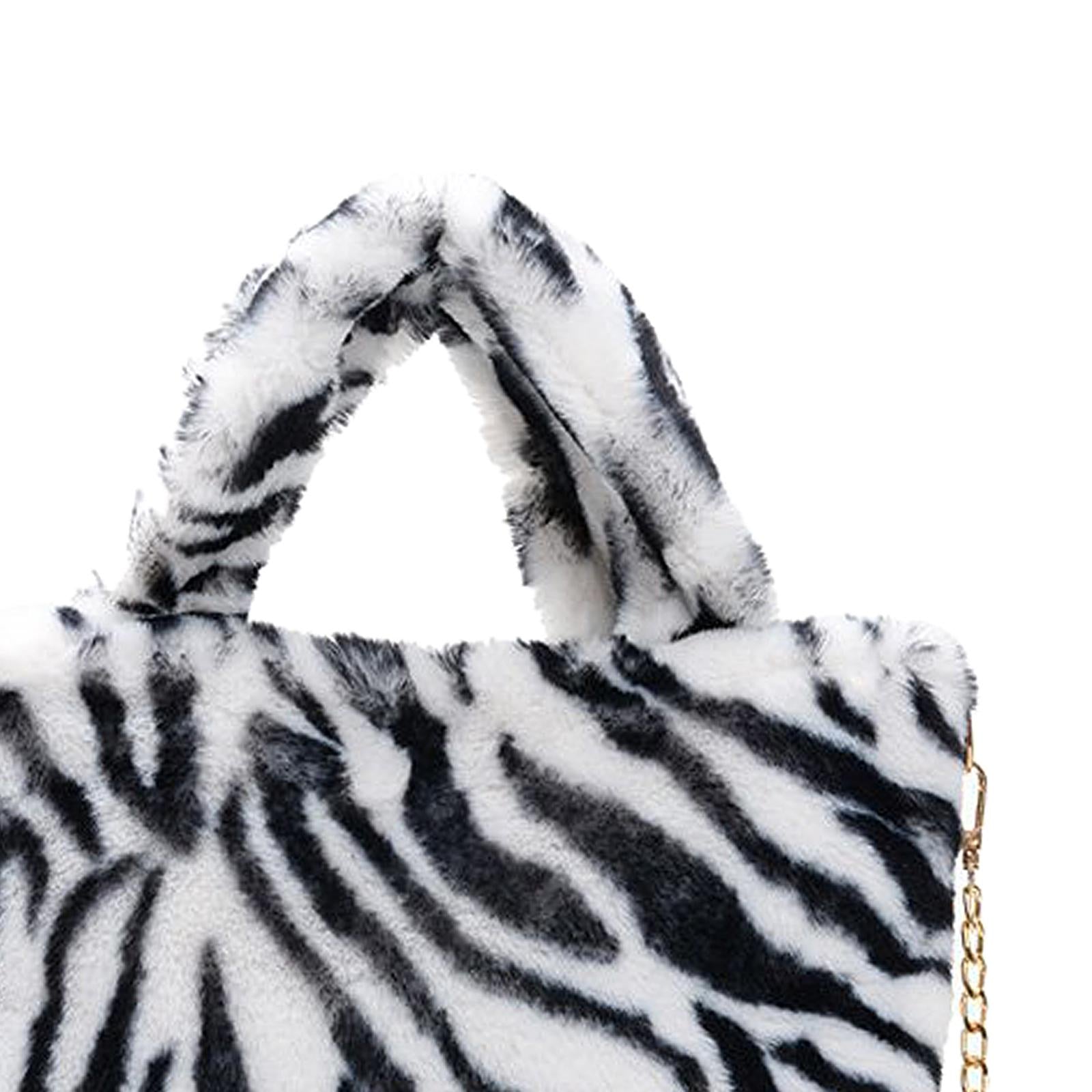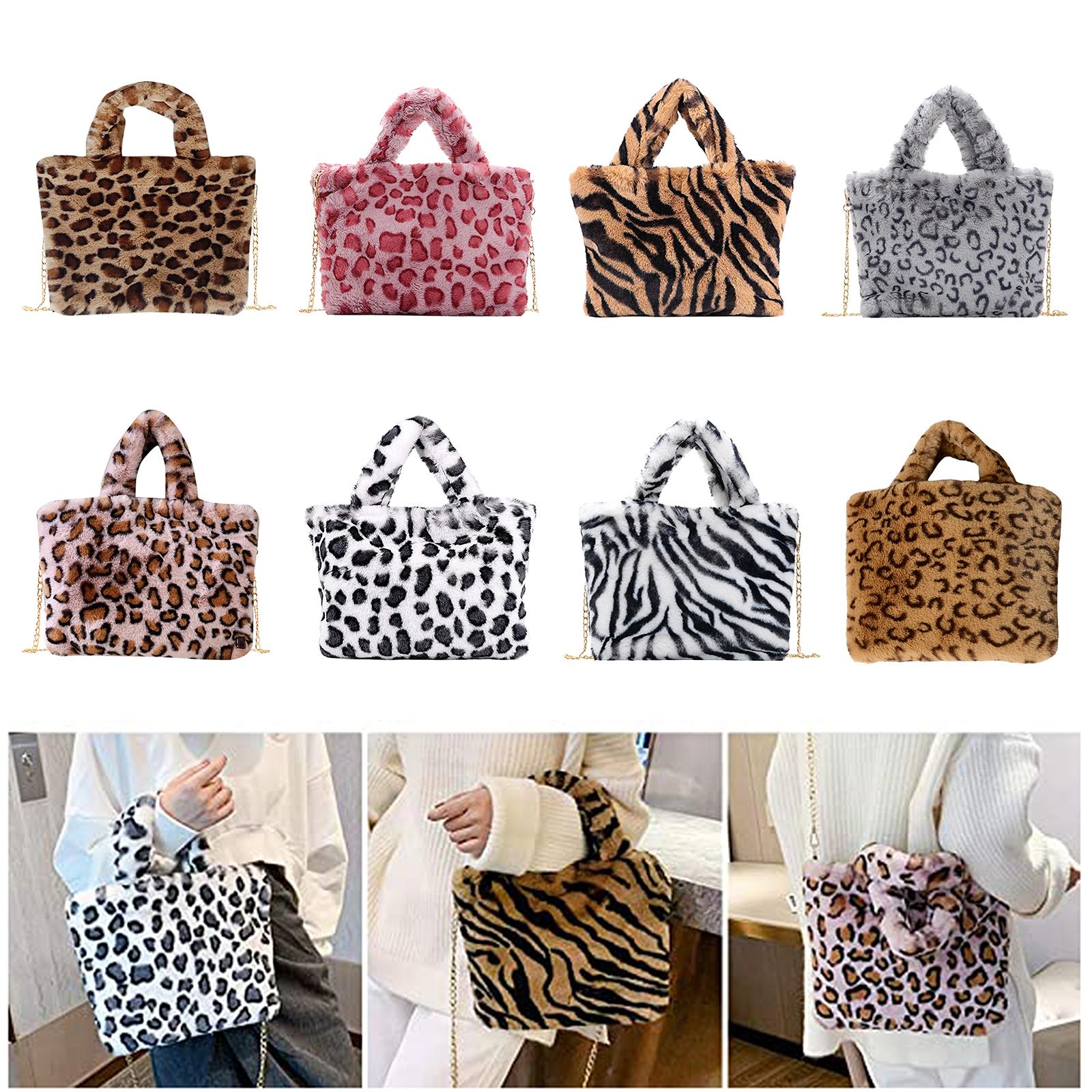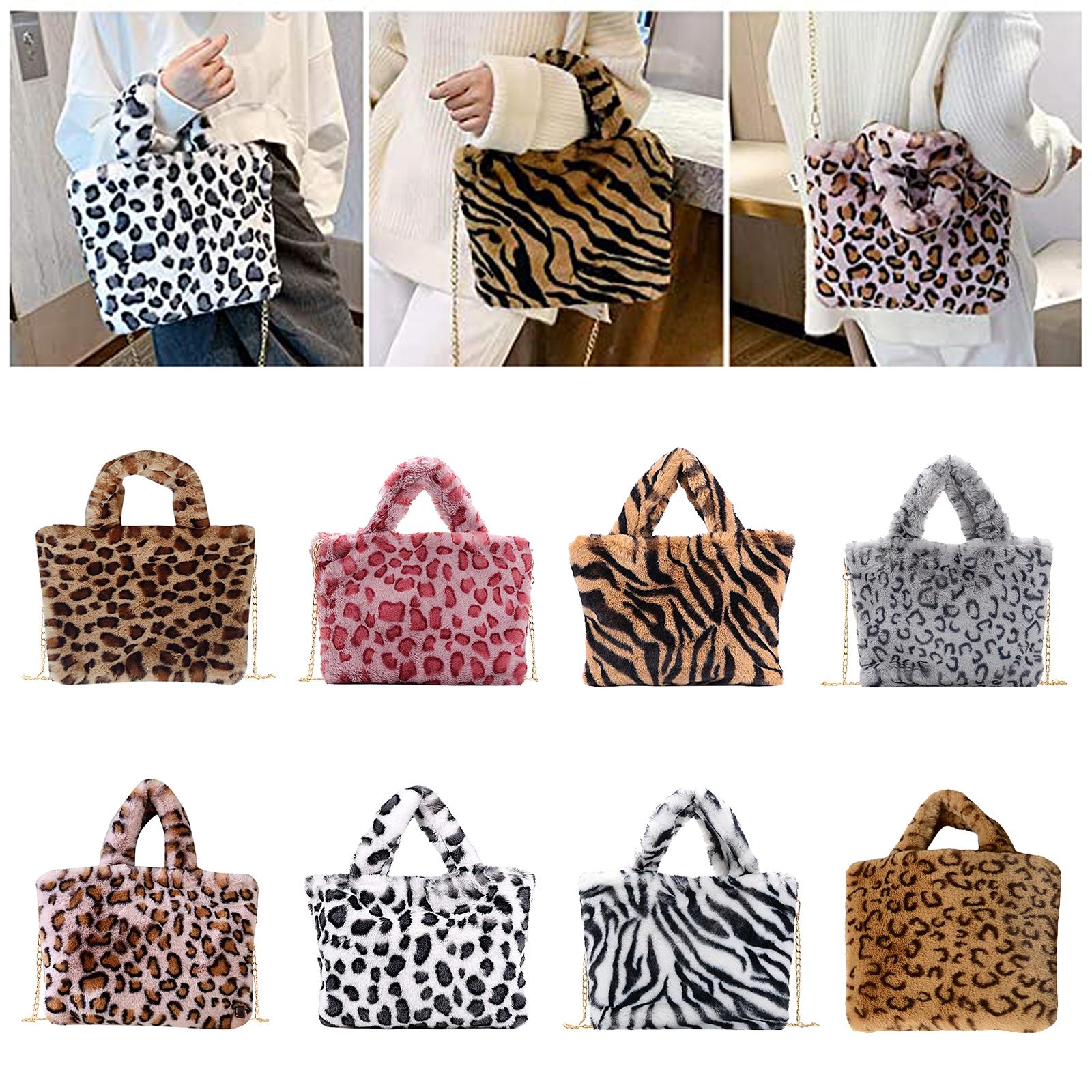 Womens Fashion Animal Print Crossbody Handbag Plush Soft Casual Shoulder Bag Tote with Metal Chain Strap.