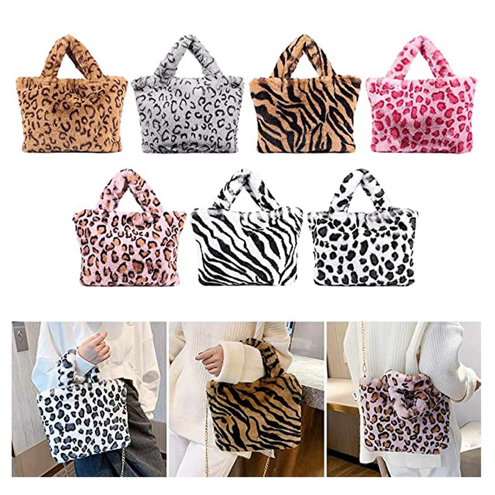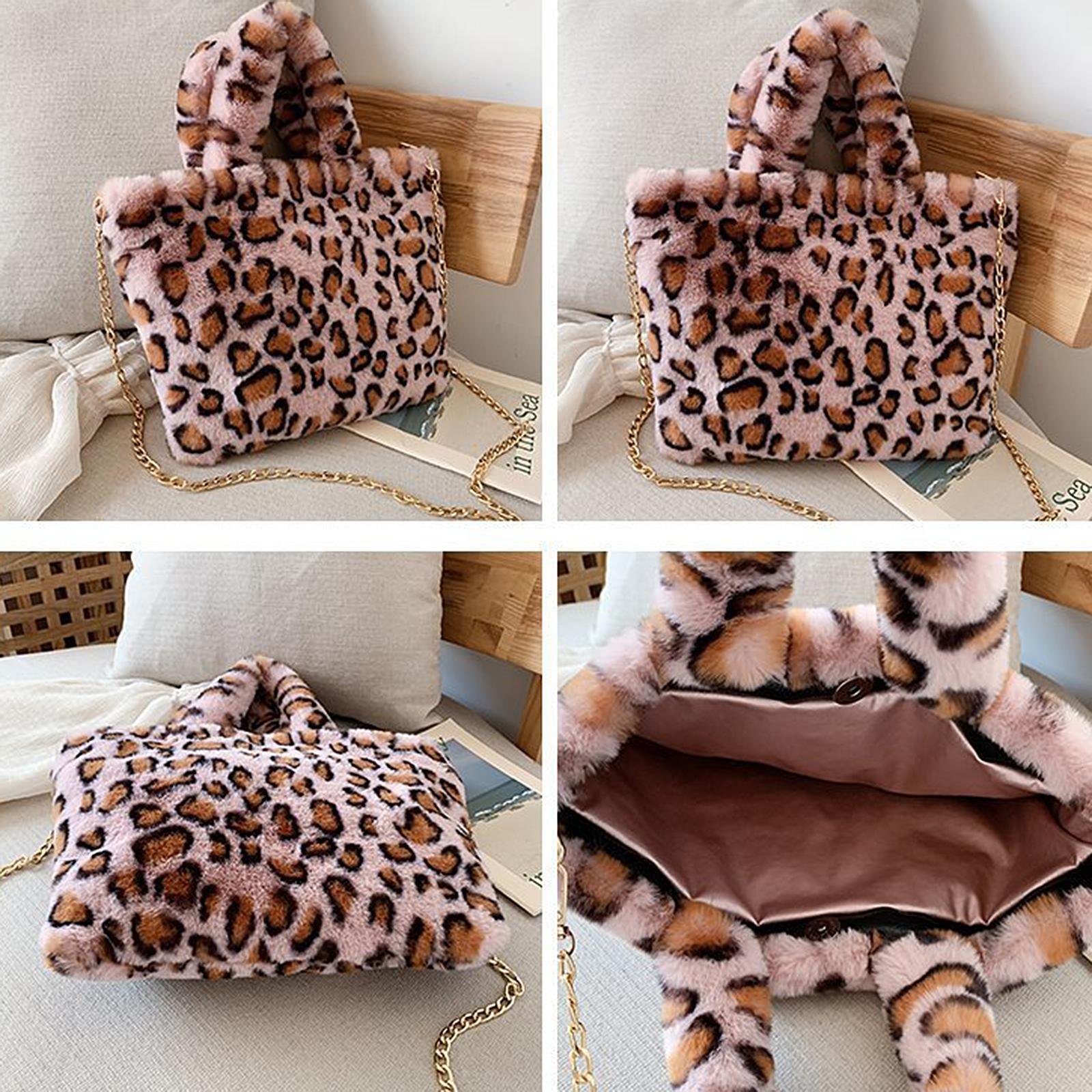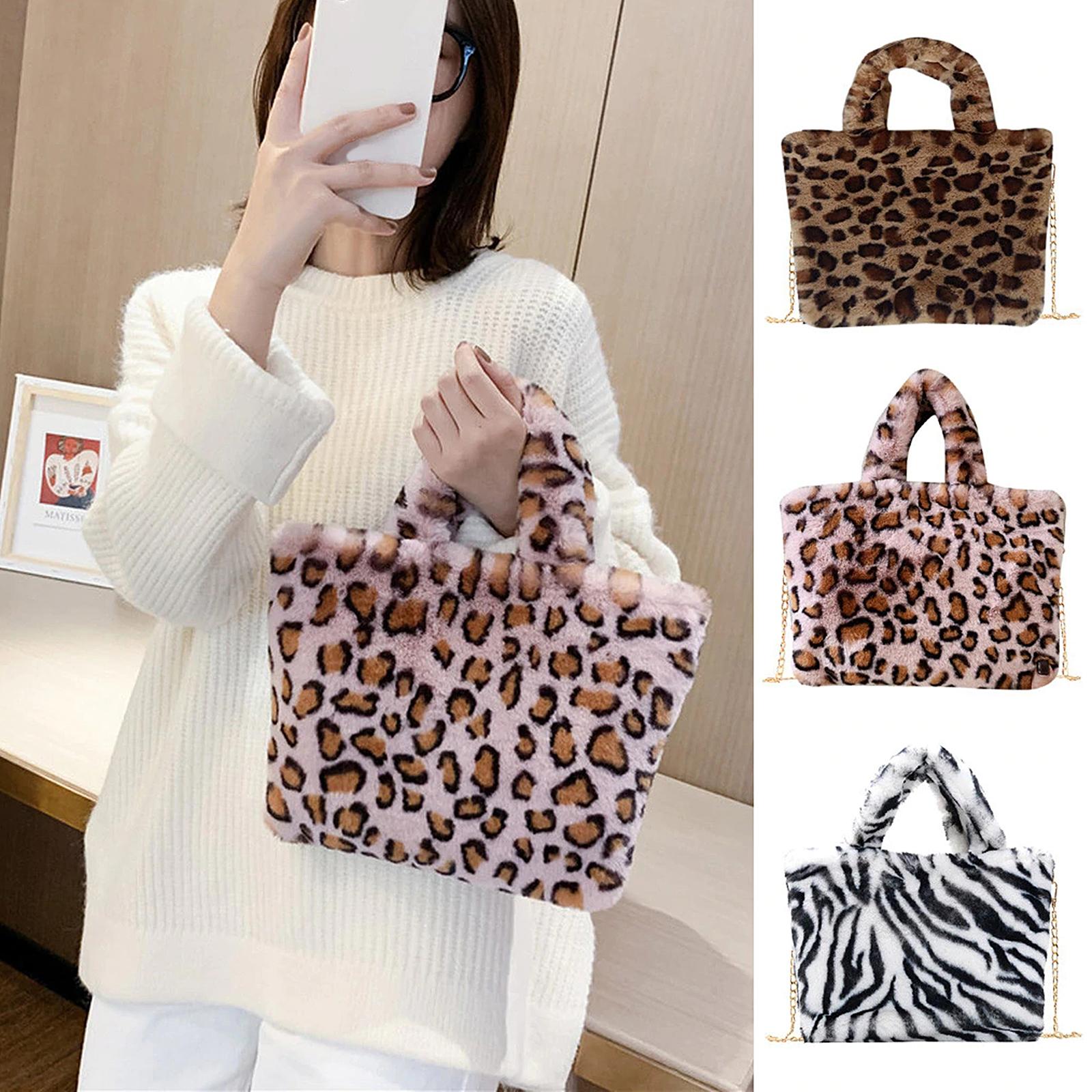 Womens Fashion Animal Print Crossbody Handbag Plush Soft Casual Shoulder Bag Tote with Metal Chain Strap.