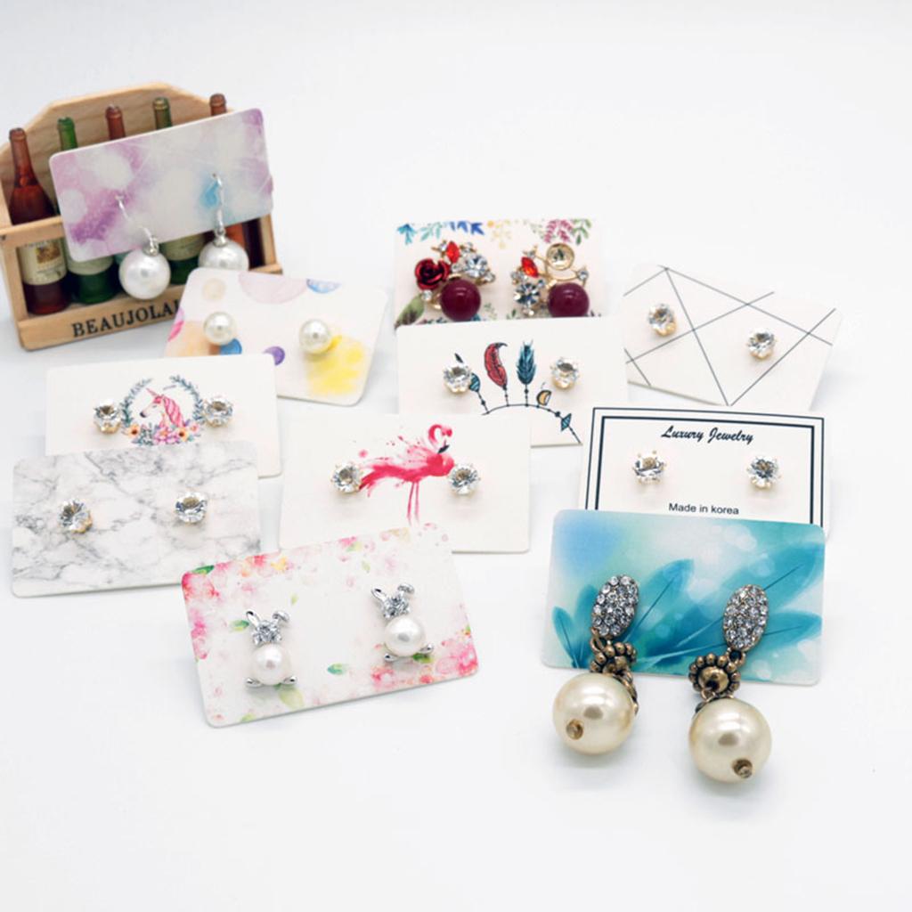 We have 9 style of earrings display cards for your choice - Green Feather, Marbling, Pink Flower, Color Dot, Unicorn, Leaves, Shining star, Black line and Elegant Flamingo.