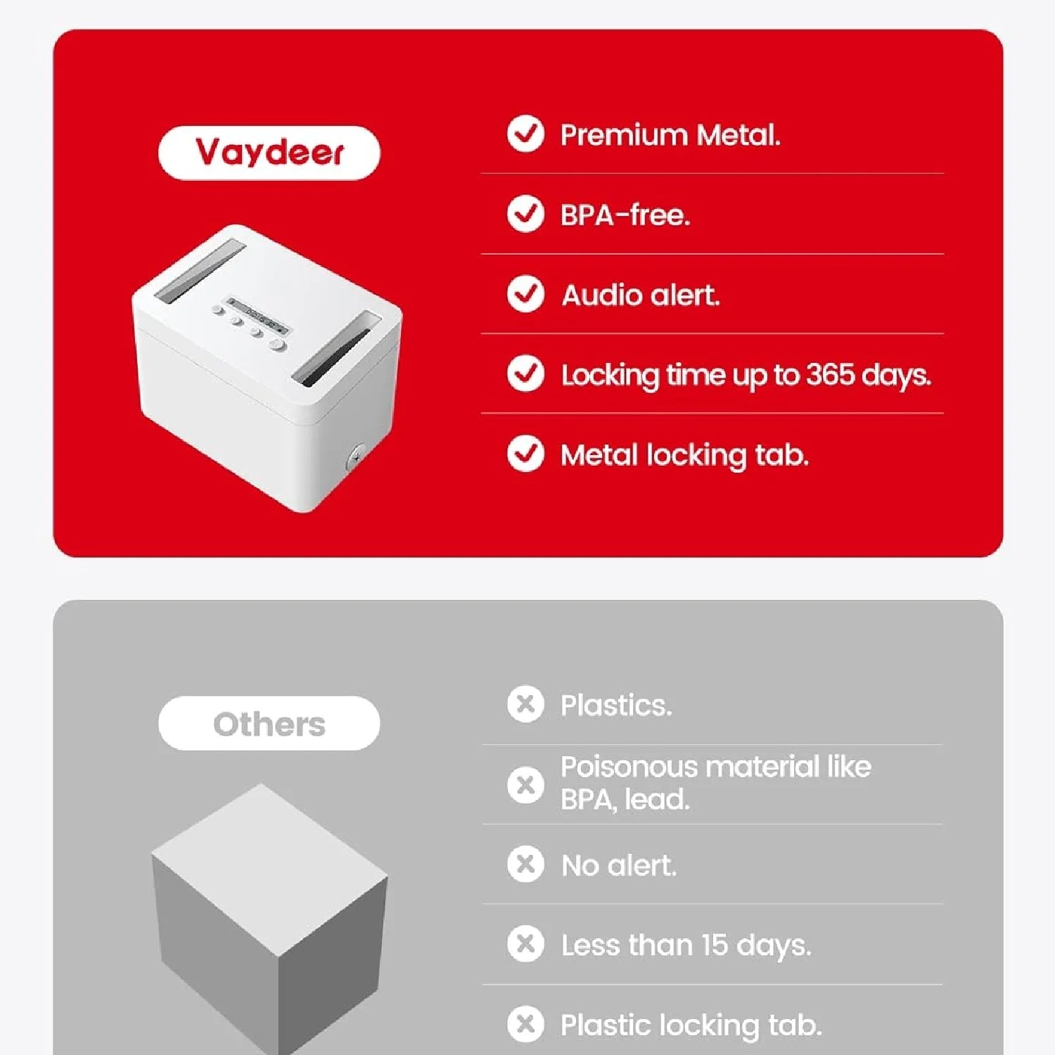 1. Set the time regularly, do not unlock before the time, reject procrastination, and manage time efficiently 2. A timed lock box designed for those who are addicted to mobile phones for a long time and cannot concentrate on study and work, forget to take medicine, cannot control snacks, forget to remind themselves to exercise, and develop good regular living habits. 3. Metal material, harder and more stable 4. Child mode to prevent children from misoperation 5. 365 days long setup time 6. Multiple power supply methods: 4 AA batteries (not included), or Type-C emergency power supply 7. You can also charge your phone when locked 8. Large capacity, can store a variety of items, such as mobile phones/game consoles/tablets/snacks/remote controls/cigarettes and alcohol, etc. 9. Size: Medium 212 x 150 x 154.2mm, Small 212 x 80 x 154.2mm