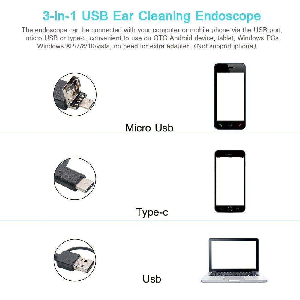 description":"Want to clean the foreign matter of ear? Want to clear the earwax with the magic earpick? Try our 3-in-1 USB Ear Cleaning Earpick Endoscope! You can stick it in your ear or apply medicine to the inner ear. This 3-in-1 USB ear cleaning endoscope comes with electronic micro-camera, you can achieve real-time observation of the whole process of digging earwax through the USB data cable.Easy to connect with PC and phones(support OTG function), very convenient to use. Features: [Multi-functional Endoscope] You can use it for daily cleaning care, cleaning ear, digging earwax and applying medicine to the inner ear, ear disease patients can also observe the ear canal. [3-in-1 USB Ear Cleaning Endoscope] The endoscope can be connected with your computer or mobile phone via the USB port, micro USB or type-c, convenient to use on OTG Android device, tablet, Windows PCs, Windows XP/7/8/10/vista, no need for extra adapter.(Not support iphone) [Camera with Adjustable LED Light] The mini 5.5mm diameter camera is equipped 6pcs of LED light with adjustable brightness so that you can use it in dark places without worrying about no amply light. [Special Focus & Ultra Small Distance to See More Clearly] This inspection camera has 0.3MP pixel, so you can see the clear pictures of your ear in your computer and mobile phones. [Practical & Interesting Household Tool] A essential tool for each family, you can tell the ear canal health status, check the ear canal and check other body parts, such as scalp, pores, comedones, ear canal, oral cavity, nasal cavity and so on. Highlights: Support System: Android/Windows/Mac Support Connector: Micro USB / TYPE-C / USB Imaging Sensor: CMOS Camera Pixel: 0.3MP Camera Resolution: 640*480 Horizontal View Angle: 70° Power Supply: USB Power Light Source: 6pcs of adjustable LED lamp brightness Diameter of Camera: 5.5mm Best Camera Focal Length: 14-20mm Pen Length: about 142.7mm / 5.62in Notice: Only work with Android system phone, does not support iOS system. Suitable mobile phones need to be equipped: 1.Your Android phone must support OTG function, 2. Your Android phone must support OTG function UVC free drive camera, 3. Android 4.2 and all above are necessary and indispensable! Specification: Model: i96-30 Color: Black Material: Aluminum Alloy Support Capture Image Format: JPEG Support Recording Video Format: AVI Cable Length: 2m / 6.56ftin Cleaning Method: Wipe with alcohol Endoscope Weight: approx. 82g / 2.89oz Package Size: approx. 20 * 10 * 2.8cm / 7.87 * 3.94 * 1.10in Package Weight: approx. 115g / 4.06oz Package List: 1 * 3-in-1 Ear Cleaning Endoscope 1 * Plastic Earpicks 1 * Annular Earpicks 1 * Protective Sleeve 1 * Camera Protective Cover 1 * Cleaning Cloth 1 * Oral Mirro 1 * User Manual(English)