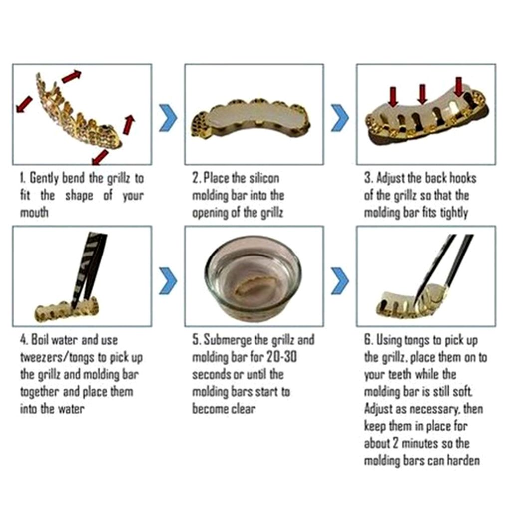 - 3. Put the gold (silver) tooth into your mouth and gently bite the gold (silver) tooth with the upper and lower teeth. Adjust as necessary for the fit and look you desire. The fixing bar should take approximately 15-20 seconds to harden.