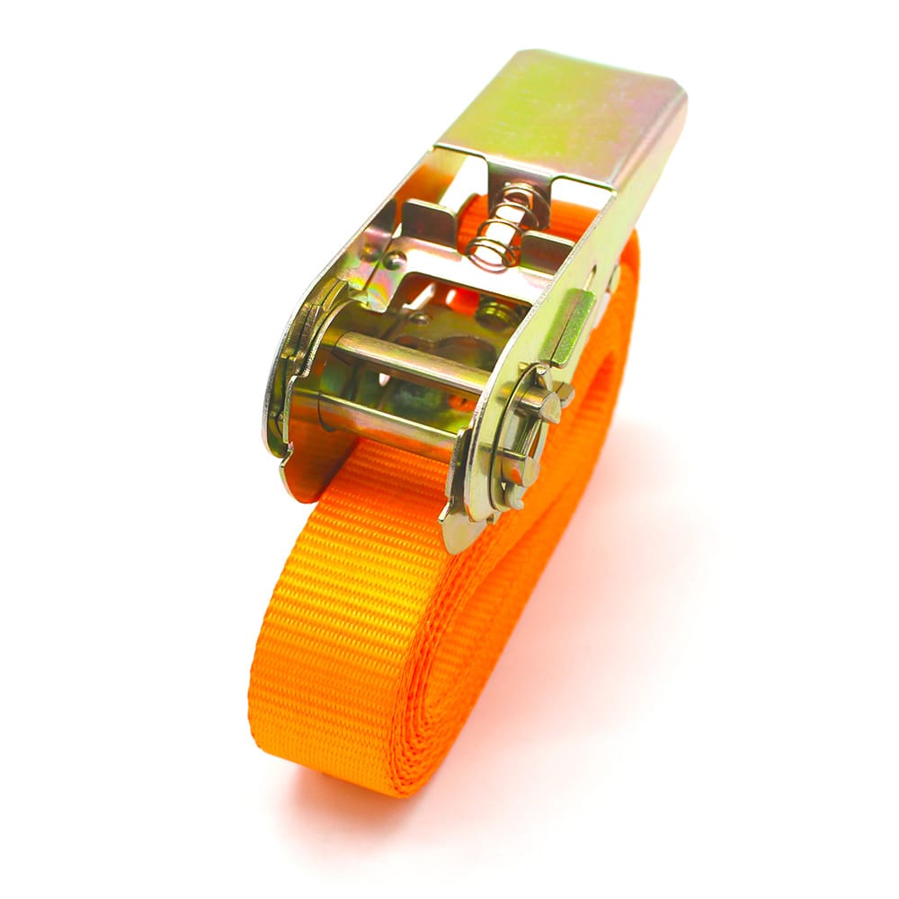 This ratcheting tie down strap is perfect for home or commercial use! Featuring industrial grade nylon webbing each strap is D.O.T. and C.H.P rated meaning that you never have to worry about the stability of your items while they are tied down. The heat treated zinc coated steel hooks are flat and easily slide into place to secure the ratchet. The wide grip molded handle fits comfortably in your hand for optimal performance and the ratchet features an easy release mechanism to easily release the tension on the strap. The strap itself is 1 inch x 13 feet (2.5cm x 4m) and features a strength of 2 200 pounds with a load limit of 1 700 pounds. This ratcheting tie down strap will provide you with the best cargo solution for your needs in terms of quality and value!Features:Super strong zinc coated steel buckles.Heavy duty cambuckle with 1 700lb (800kg) break strength.Easy release mechanism to easily release the tension on the strap.For lighter loads often hauled in a pick-up truck or on a small trailer.Provides you with the best cargo solution for your needs in terms of quality and value!Specifications:Color: OrangeMaterial: Polyester fiber webbing steel buckleOverall Length: 4m / 13ftWidth: 25mm / 1 inchPackage List:1 * Cargo Strap