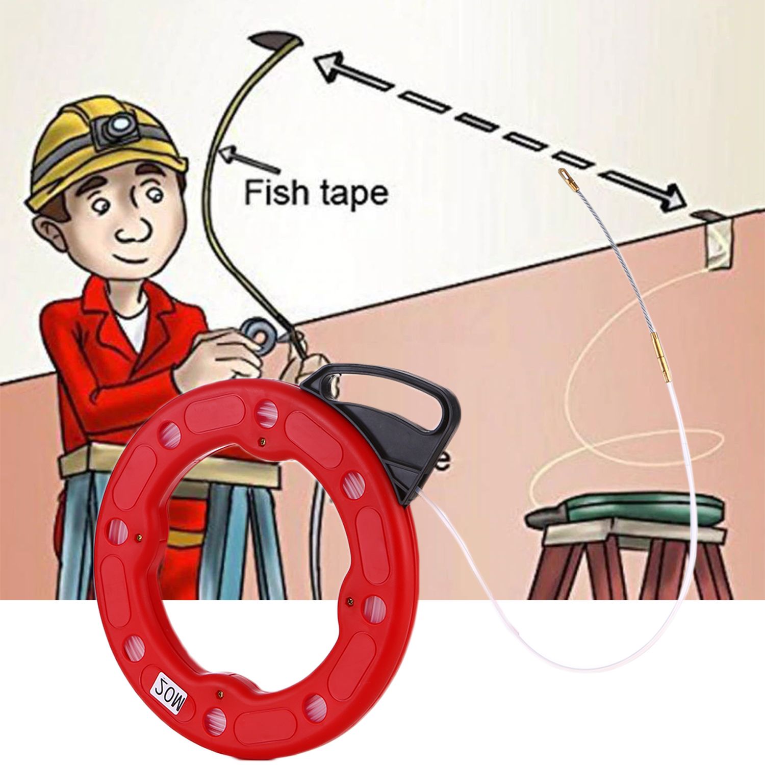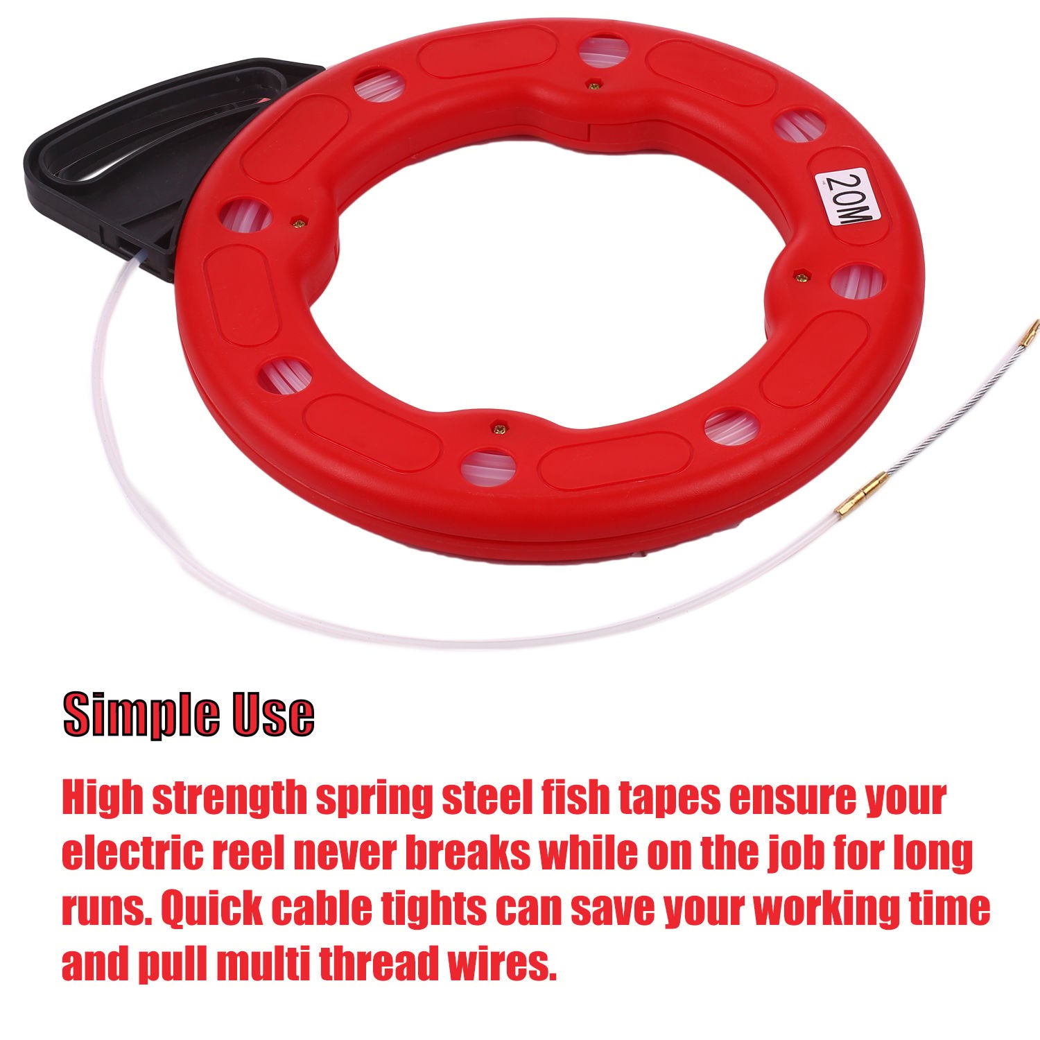 This heavy duty wire puller is perfect for for short cable runs associated with light commercial residential and voice-data-video-audio installations. Large handle + high quality steel pulling wire smoother and efficiency.Features:Smoother Faster Pulling --- High quality steel tape keeps its stability as it glides between surfaces for effective pushing and pulling of wire under carpets through insulated walls and over suspended ceilings. Flexible steel tape never get stuck or bend make input and output more efficiently and effortlessly.Effortless Take --- Impact case with handle and finger fitting grips around reel give you a firm steady grip as you pull tape from the case. Tape is wound directly into housing no need to snap retaining tapes.Simple Use --- High strength spring steel fish tapes ensure your electric reel never breaks while on the job for long runs.Quick cable tights can save your working time and pull multi thread wires.Longevity --- Adopt steel wire material which is durable and corrosion resistant and also with high spring make it more convenient for wire pulling and provide a long service time.Wide Application --- Perfect for Snaking/Thread or Pulling Cables and Wires through or Behind Ceiling Walls/Drywall Conduit PVC Pipe Vent Duct Hose Under Carpet or Insulation and more for your interior and exterior Electrical Site Wiring. A great choice for construction workers carpenters DIY and home remodelingSpecification:Type:Cable PullerColor:Black+RedMaterial: Nylon Fiberglass +ABSLength: 15/20/30m ?optional?Pack Size: 380 * 290 * 35mmApplication: For Pulling Wire and CablePacking List:1 * Wire Puller