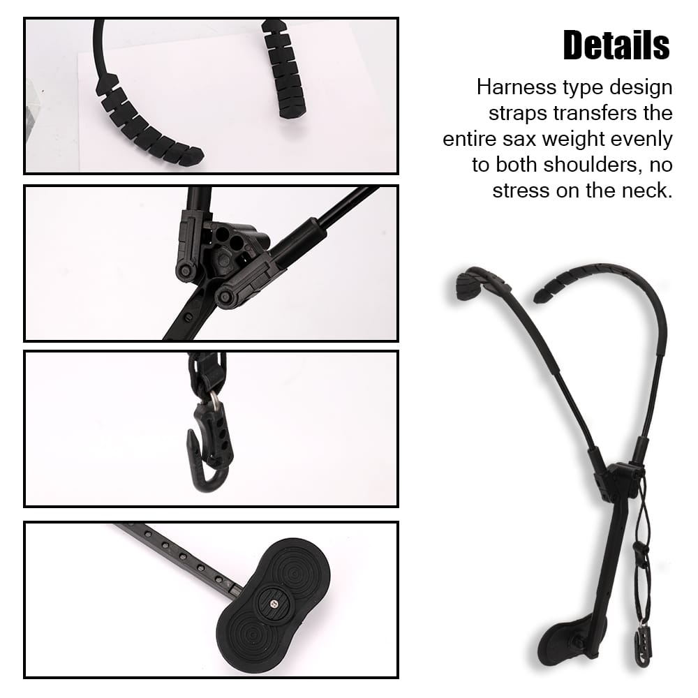Harness type design straps transfers the entire sax weight evenly to both shoulders no stress on the neck.Features:Can be put on by one hand in seconds.Saves space smaller than a sheet of paper when folded.Pretty comfortable when sitting or standing since it does not slip away.Designed for both men and women performers.Can be set quickly and easily: swing both shoulder handles up pull out the telescopic slide rotate the abdominal rest ready.Specifications:Color: blackStrap width: 30mm / 1.2inStrap length: max. 380mm / 15.0inPackage size: 320 * 180 * 60mm / 12.6 * 7.1 * 2.4inPackage weight: 280g / 9.9ouncePackage list:1 * Saxophones Strap