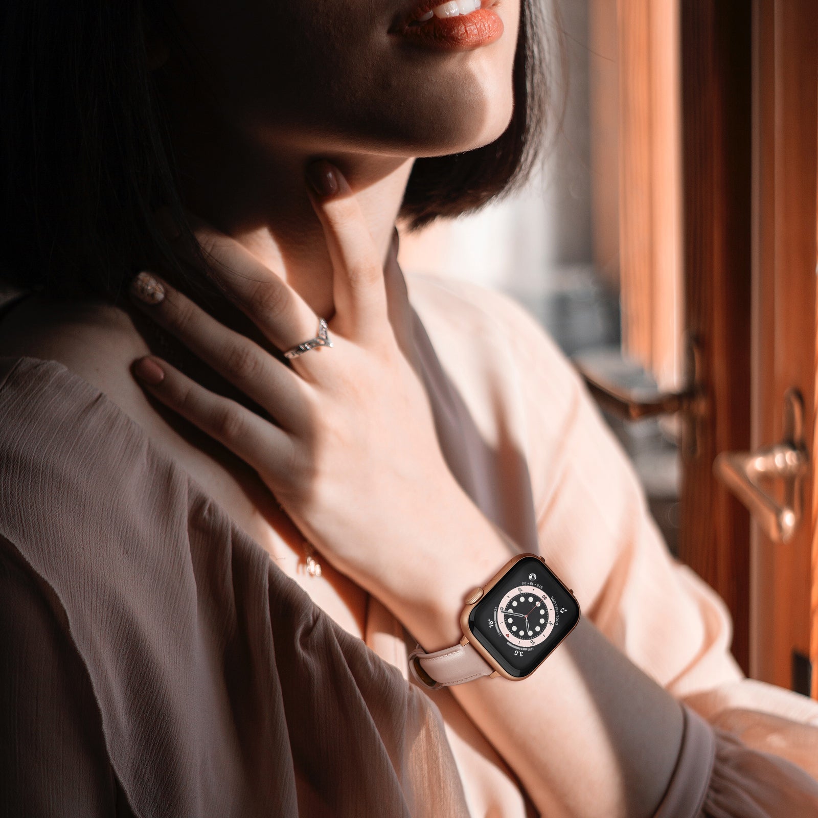 Genuine Leather Replacement Smart Watch Band Adjustable Wrist Strap for Watch Ultra 49mm / Series 8 / 7 45mm / Series 6 / 5 / 4 / SE / SE (2022) 44mm / Series 3 / 2 / 1 42mm - Pink / Rose Gold Buckle