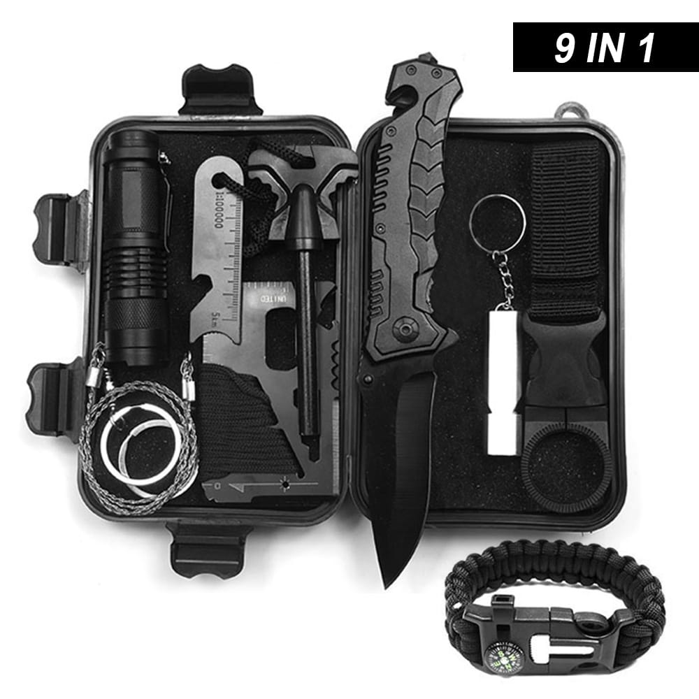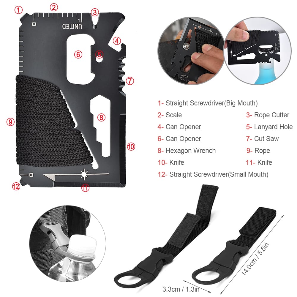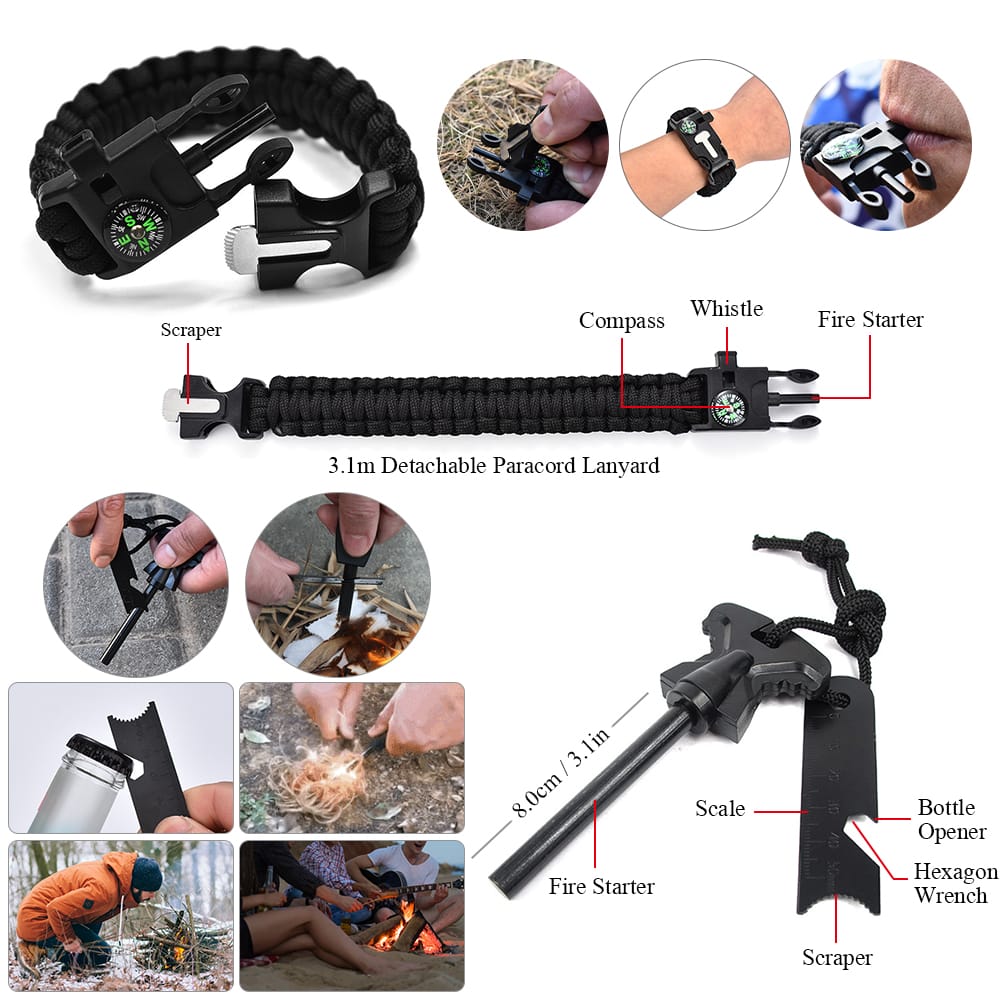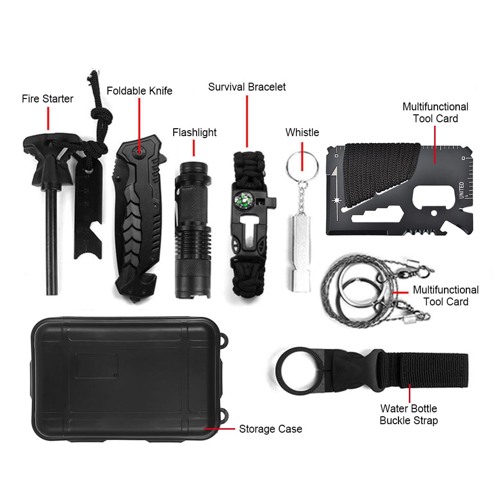 This Multifunctional Survival Kit with different kinds of tools meets your different demands and provides moreconvenience.Suitable for survival backpacking camping hiking fishing etc.Features:Survival kit includes fire starter foldable knife flashlight (battery not included) survival bracelet whistle multifunctional toolcard emergency wire saw water bottle buckle strap and storage box.Foldable knife with serrated design includes emergency hammer and bottle opener.5 in 1 survival bracelet features on 3.1m detachable paracord lanyard fire starter scraper whistle and compass.5 in 1 fire starter includes scraper bottle opener hexagon wrench and scale.The flashlight (battery not included)with 3 lighting modes meets your different demands.Multifunctional tool card consists of rope scale hexagon wrench knives screwdrivers can opener bottle opener and cut saw.Emergency wire saw with strong tensile strength and two rings easy to cutting trees(no more than 3 inches).Water bottle buckle strap easy to attach your backpack.Compact size suitable for camping hiking rescue work travel adventure survival and in emergency situations.Specification:Material: plastic metalCase size: 170*105*50mm/6.7*4.1*2.0inUnfoldable knife size: 21.0*4.0cm/8.3*1.6inFoldable knife size: 12.5*4.0cm/4.9*1.6inFlashlight size: 9.2*2.7cm/3.6*1.1inFlint stone length: 8.0cm/3.1inMultifunctional tool card size: 8.6*5.5cm/3.4*2.2inBottle buckle strap size: 14.0*3.3cm/5.5*1.3inWeight: Approx.487g/17.2ozPackage weight: Approx. 500g/17.6ozPackage List:1* Fire Starter1* Foldable Knife1* Flashlight (battery not included)1* Survival Bracelet1* Whistle1* Multifunctional Tool Card1* Emergency Wire Saw1* Water Bottle Buckle Strap1* Storage Case