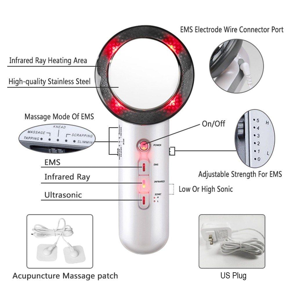 description":"Description: This 3 in 1 Slimming & Beautify Device brings you an even better effect. It enables you to shape a charming body line and to restore the resilience of your skin within a short period of time. Just come and have a try now! Features: 3 in 1 design,EMS Muscle Stimulator + Far Infrared + Ultrasonic Wave. For EMS mode: use it for 15-30 minutes on the parts that need slimming, better to do on acupuncture points. For far infrared mode: point the infrared at areas needed and the wave energy will be released into the skin. For ultrasonic wave mode: press the sonic button once for low intensity on face, twice for high intensity for arms or legs. Great multifunctional massager to shape your boby and keep you skin more resilient and tighter. Specification: Type: Body Slimming Massager Material: ABS Color: White Plug: US Plug Modes: EMS Muscle Stimulator + Far Infrared + Ultrasonic Wave Adaptor Input Power: AC 100-240V Adaptor Output Power: 15V, 800mA Ultrasonic Frequency: 1 MHz Item Size: 19 * 8.0 * 6.0cm / 7.5 * 3.2 * 2.4in Item Weight: 207g / 7.3oz Package Size: 25 * 18 * 7.0cm / 9.8 * 7.1 * 2.8in Package Weight: 630g / 22.3oz Package List: 1 * Main Machine 1 * US Plug 2 * Contact Pad 1 * Electrode Cable 1 * User Manual
