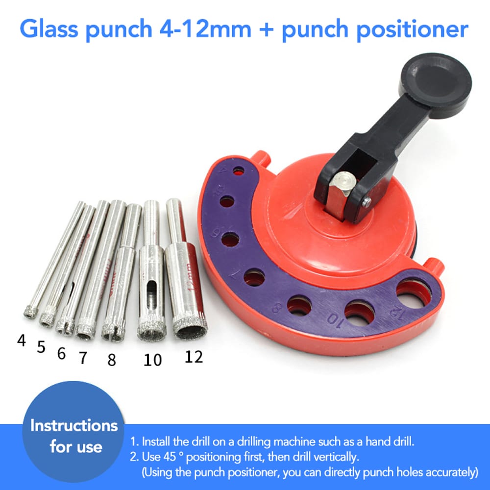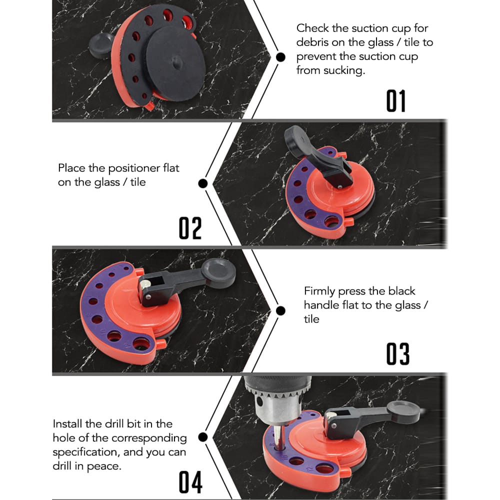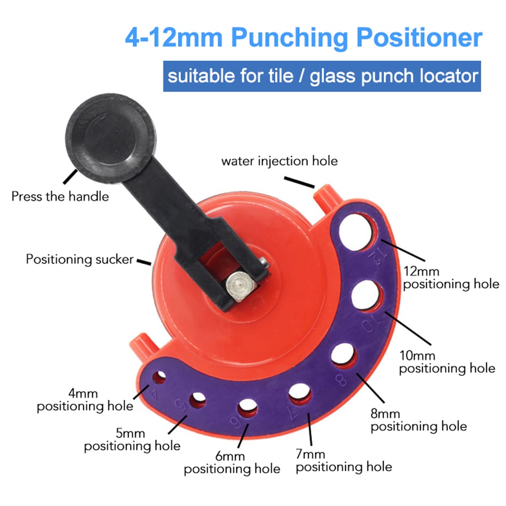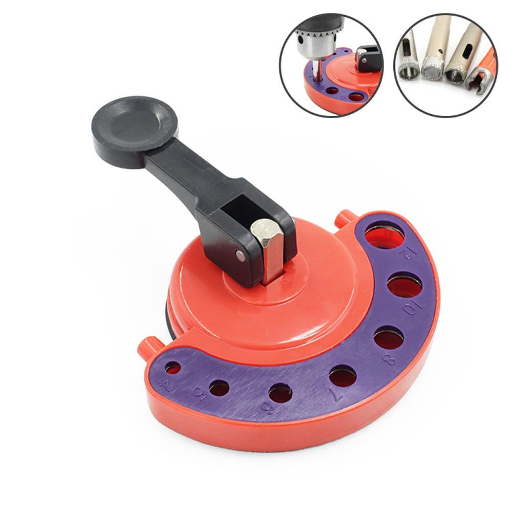 Apply to positioning action when used in glass tile drilling?Features:Designed to drill glass ceramic tiles marble and slate Diamond.Perfect for those hard to reach awkward areas.Drilling horizontally in tiled wall or vertically in floors is much easier with this guide.Attaches to most tiled surfaces by means of its lever operated vacuum base.Suit for 4mm(5/32 inch) 5mm(13/64 inch) 6mm(15/64 inch) 7mm(9/32 inch) 8mm(5/16 inch) 10mm(3/8 inch) 12mm(15/32 inch) drill bits.Specifications:Main color: blue+red+blackItem size: 102 * 98mm / 4.0 * 3.9inItem weight:104g / 3.7ouncePackage size: 130 * 120 * 40mm / 5.1 * 4.7 * 1.6inPackage weight: 150g / 5.3ouncePacking List:1 * Drill Guider