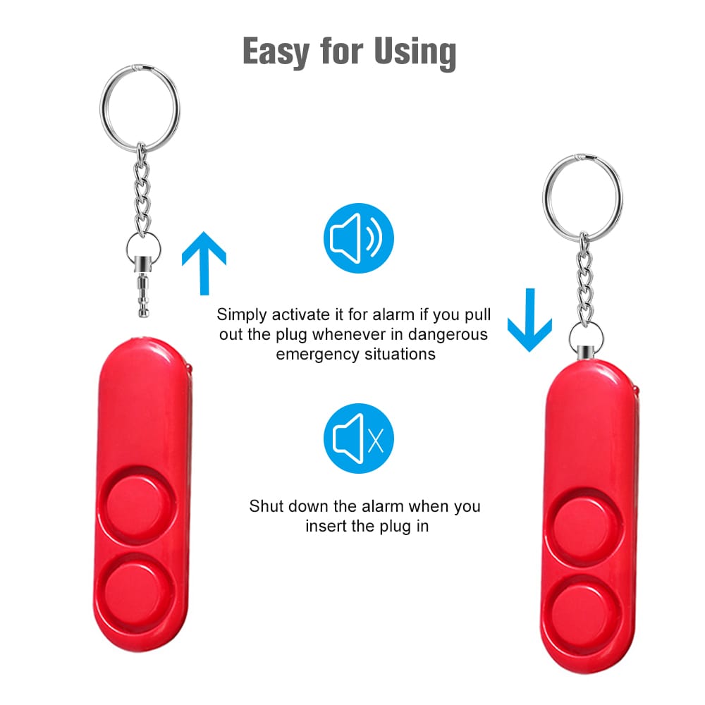 Features:*High-Decibel Design: When you are in danger you can pull out the key ring on the top it will alarm with 120dB piercing sound deterring the attacker scaring away bad guys giving warning to the people around you getting timely protection. Turn off to stop it.*Suitable for A Variety of People: It is an ideal self defense alarm especially for women kids explorers elderly etc. it can increase an individual's feelings of confidence independence and the personal safety they need in order to save their lives.*Portable Keychain Design: Small size light-weight and portable easy to carry elegant decoration. Keychain design is easy to attach with keys handbag backpack wallet's zipper cellphone's strap lady's bag men's belt much convenient.*It could be an accessory when you are travelling hiking camping hunting walking the dog etc.*Low power consumption battery is replaceable.Specifications:Powered by: Button Battery (included)Working Voltage: 5VWorking Current: 3mASound Loudness: 120dBColor: Black White Pink Red optionalMaterial: ABSItem Size: 8*2.5*1.5cmItem Weight: 40gPackage Information:Package Size: Approx. 11*5*4cm/4.3*2*1.6inPackage Weight: Approx. 40g/1.4ozPackage List:1*Personal Security Alarm