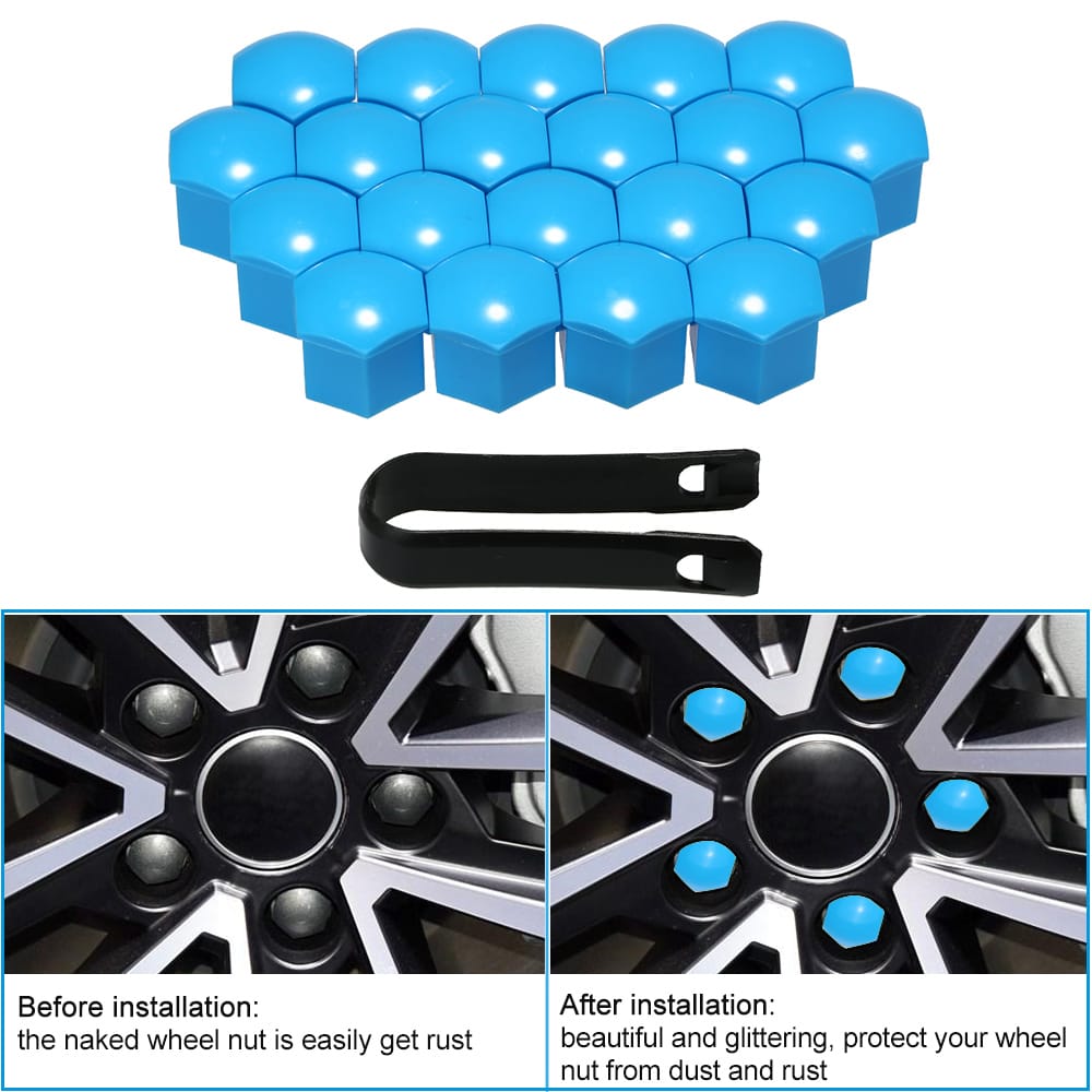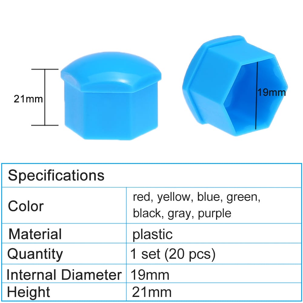 This is a pack of 19mm wheel nut covers which is universal for all 19mm standard wheel nuts.Features:Install any wheel with a 19mm bolt or nut.Simply push the bolt down to fit it securely.Enhance the smoothness of the wheel.Protect the bolt head from corrosion.Different colors for you to choose make the exterior of your car more beautiful.Specifications:Color: Red Blue Black Yellow Purple Green Gray (optional)Material: ABS plasticStandard: 19mmPackage size: 16*15*2cm/6.3*5.9*0.8cmWeight: 64g/2.25ozPackage List:20 * 19mm Nut Caps1 * Removal Tool