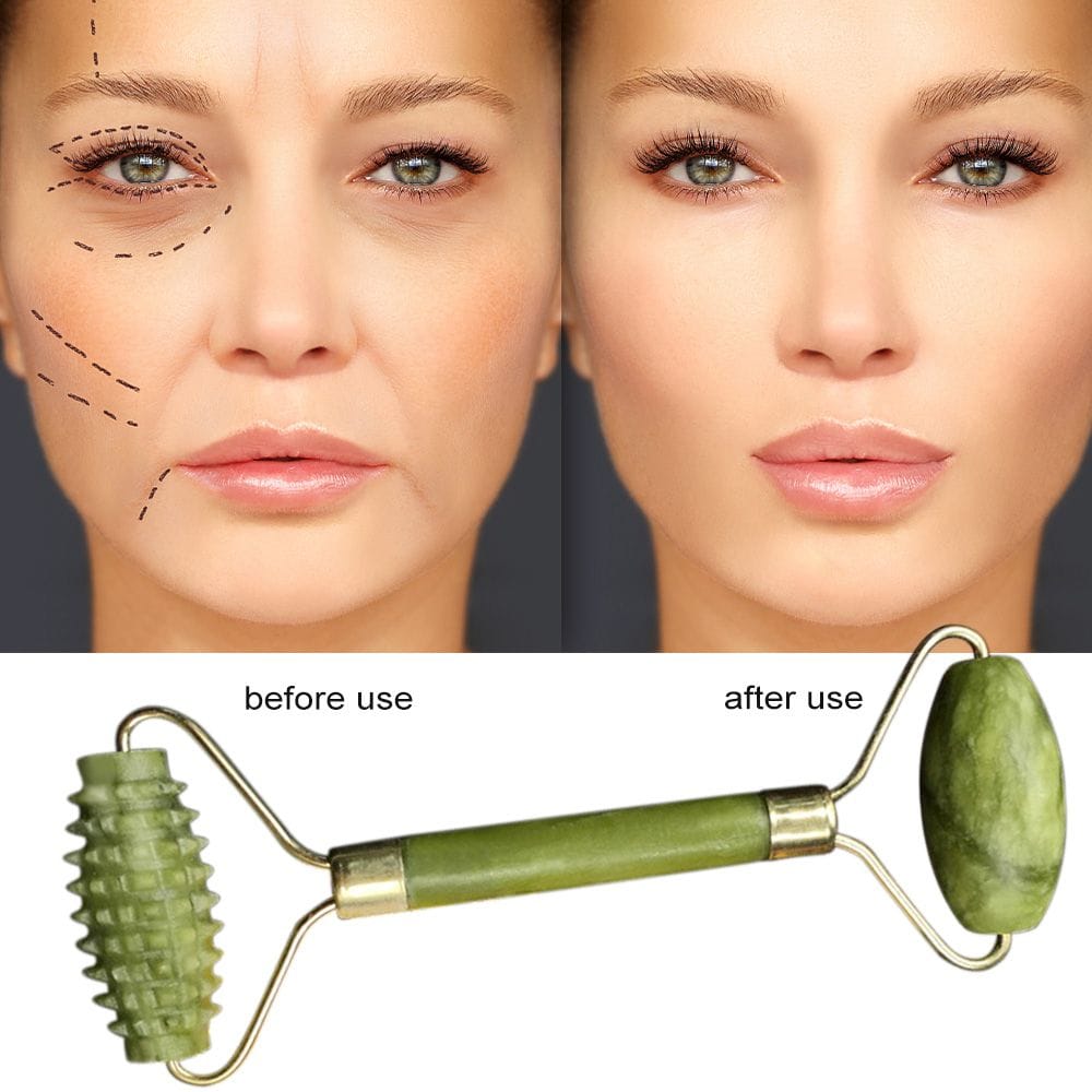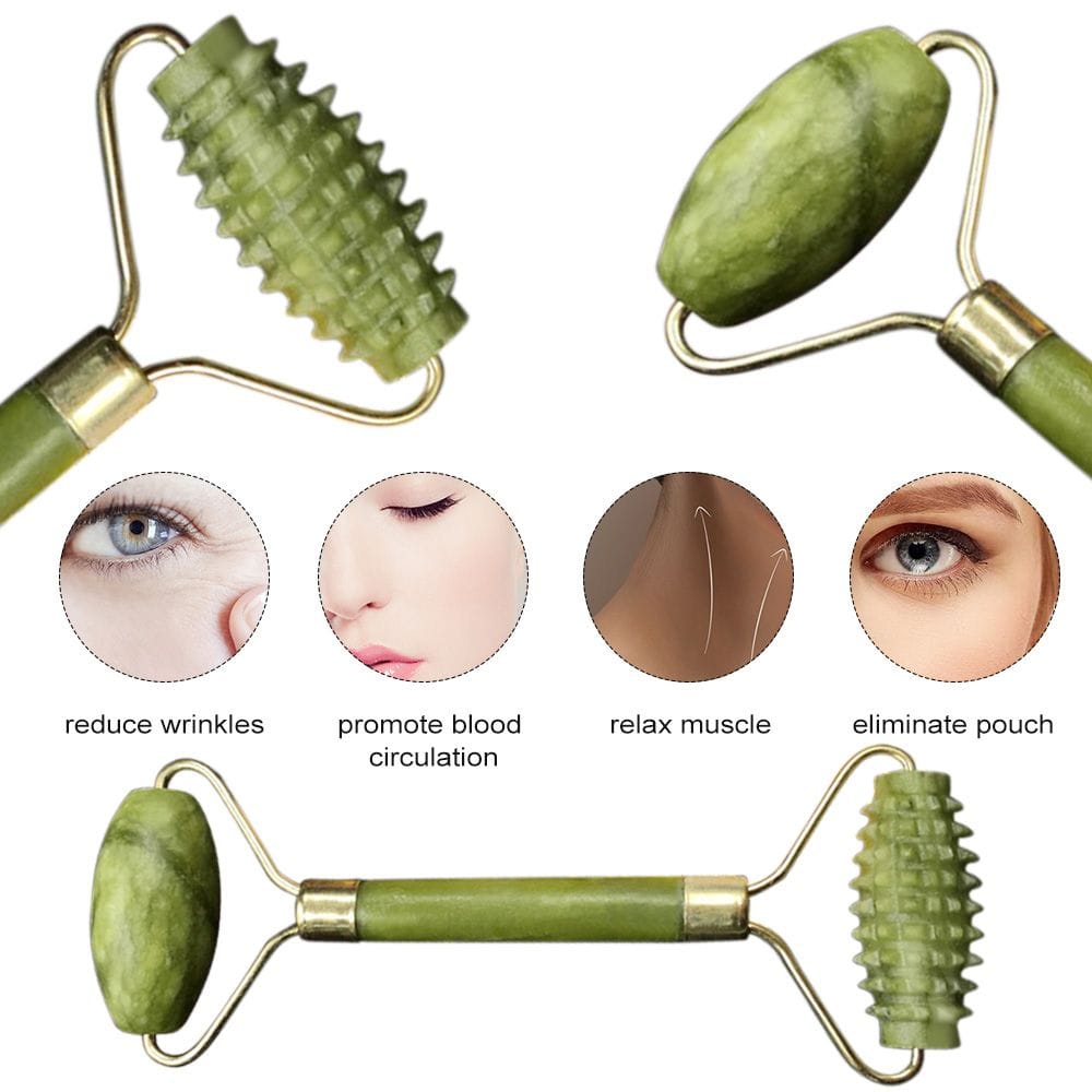 Description:The coolness of our face massager can help shrink pores while the roller promotes blood circulation which can reduce puffiness and wrinkle.Features:The big roller is ideal for neck chin cheeks forehead and other parts of body while the smaller is perfect for around the eyes nose and lips.Keep using it to massage your face for 5-10 minutes everyday or 3 days a week you will get healthier and smoother skin.Perfect for reducing puffiness around the eyes and massaging hard to reach parts of the body for full coverage.Our double-end jade roller is made from stone it has a big roller and a small roller in different designs.Smooth enough can be used for deeper and more effective facial beauty skin massage.Specification:Type: Facial Skin Care ToolMaterial: StonePackage Size: Approx. 17.5 * 8.5 * 2.5cm / 6.89 * 3.35 * 0.98inPackage Weight: Approx. 130g / 4.59ozPackage List:1 * Jade Roller1 * Protective Box