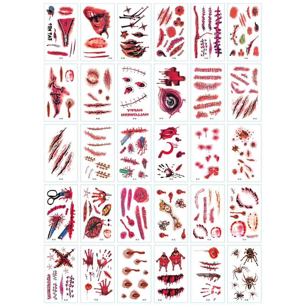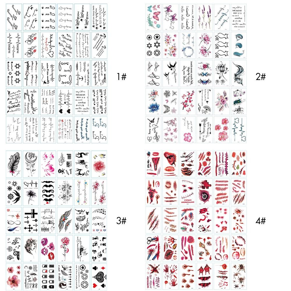 Features:Odorless safe and harmless to be applied on your skin.Waterproof scratch-resistant and long lasting.Novel decorations for Halloween costumes themed birthday parties Halloween party decorations party gifts Christmas etc.You can paste your favorite pattern on your neck arms neck shoulders stomach etc.Easy to apply and easy to clean.Specifications:Type: 1#~4# (optional)Quantity: 30pcsPackage size: 97 * 57 * 5mm / 3.82 * 2.24 * 0.2inPackage weight: 45g / 1.59ouncesUsage:Just choose the pattern you like then clean the part where you want to stick and keep it dry. After placing the pattern gently wipe the back of the pattern with a wet paper towel then remove the paper and wait for it to dry. Finally you will see the amazing and beautiful pattern in your skinNote: Due to the different display screen and light effect the actual color of the item might be slightly different from the color showed on the pictures.Package List:30 * Tattoos Stickers