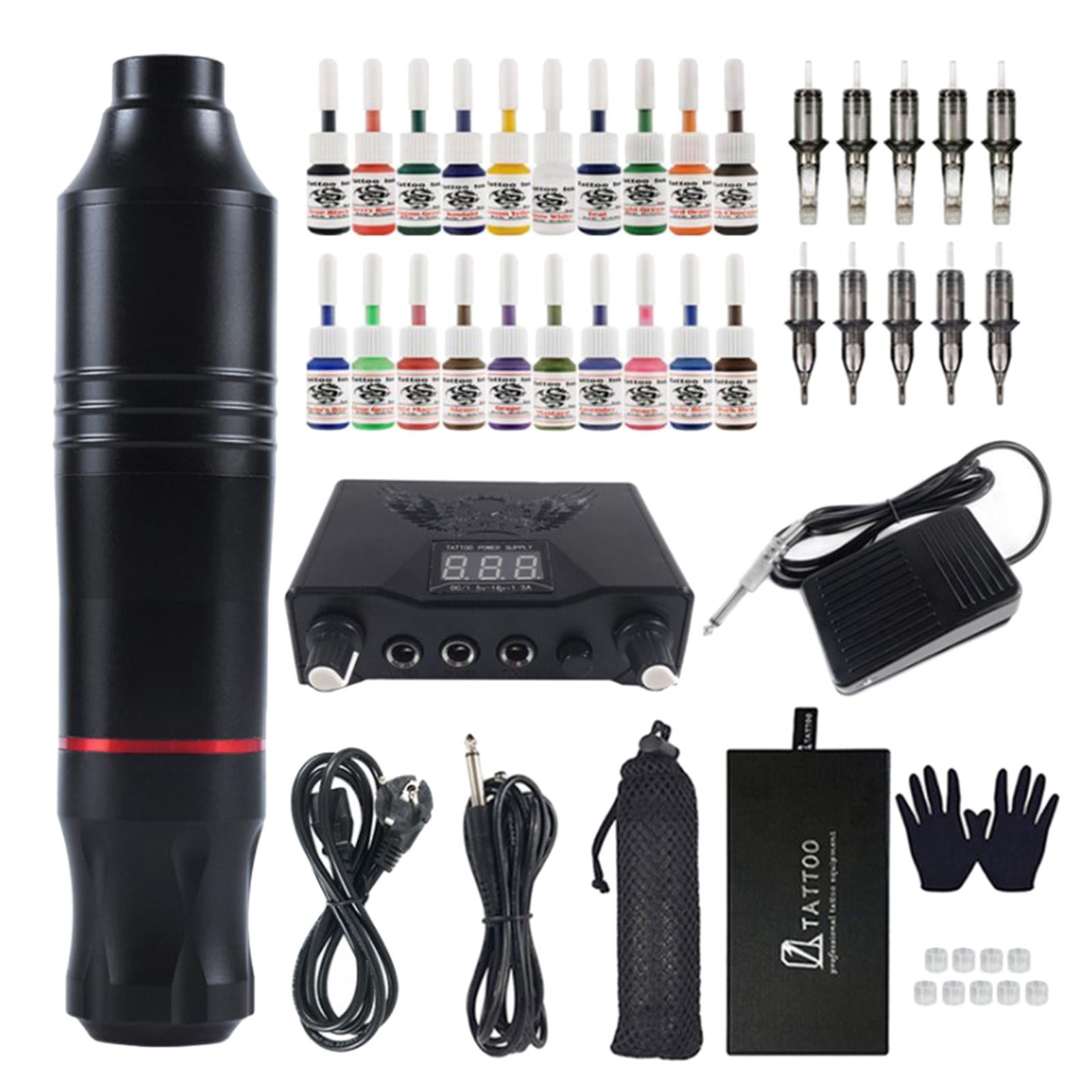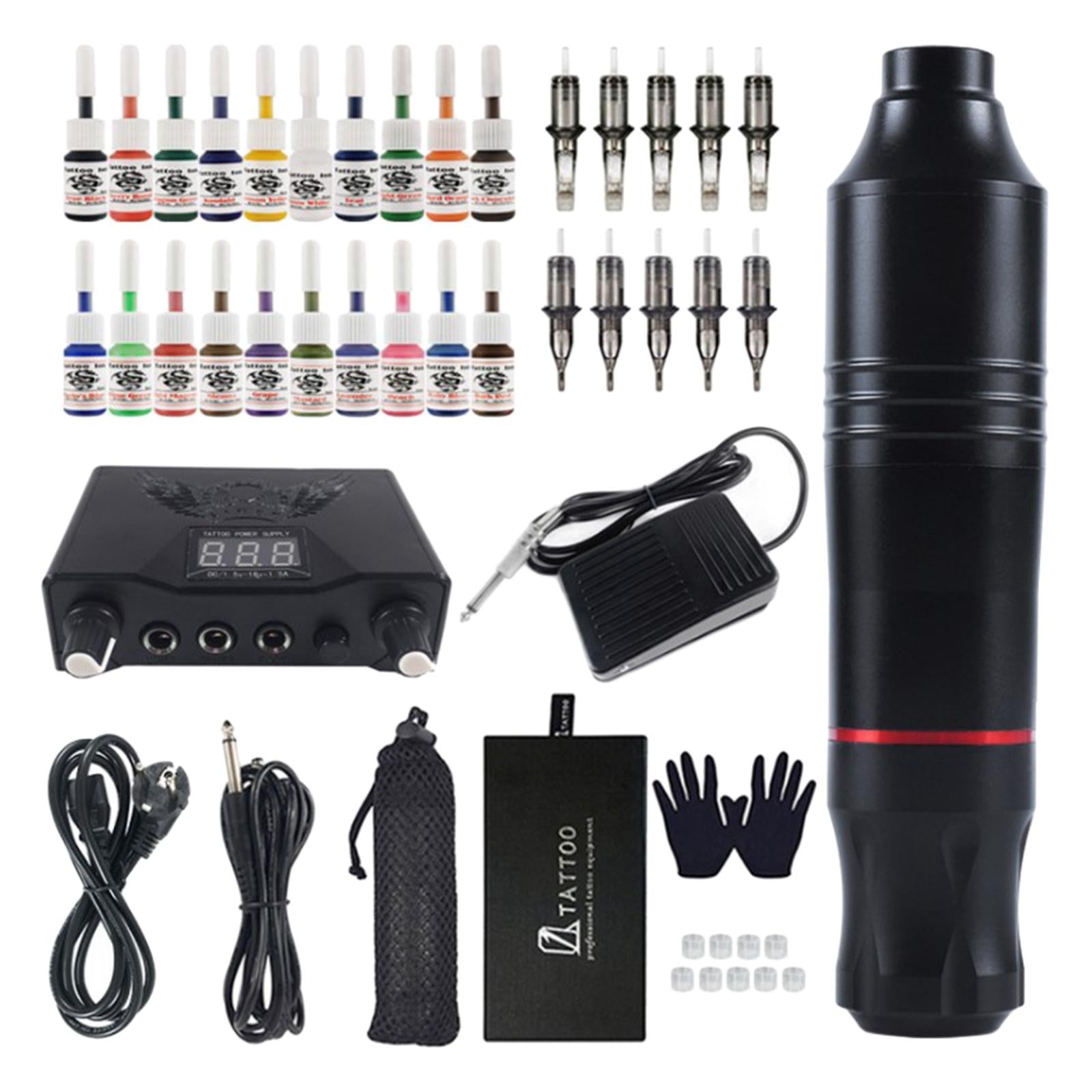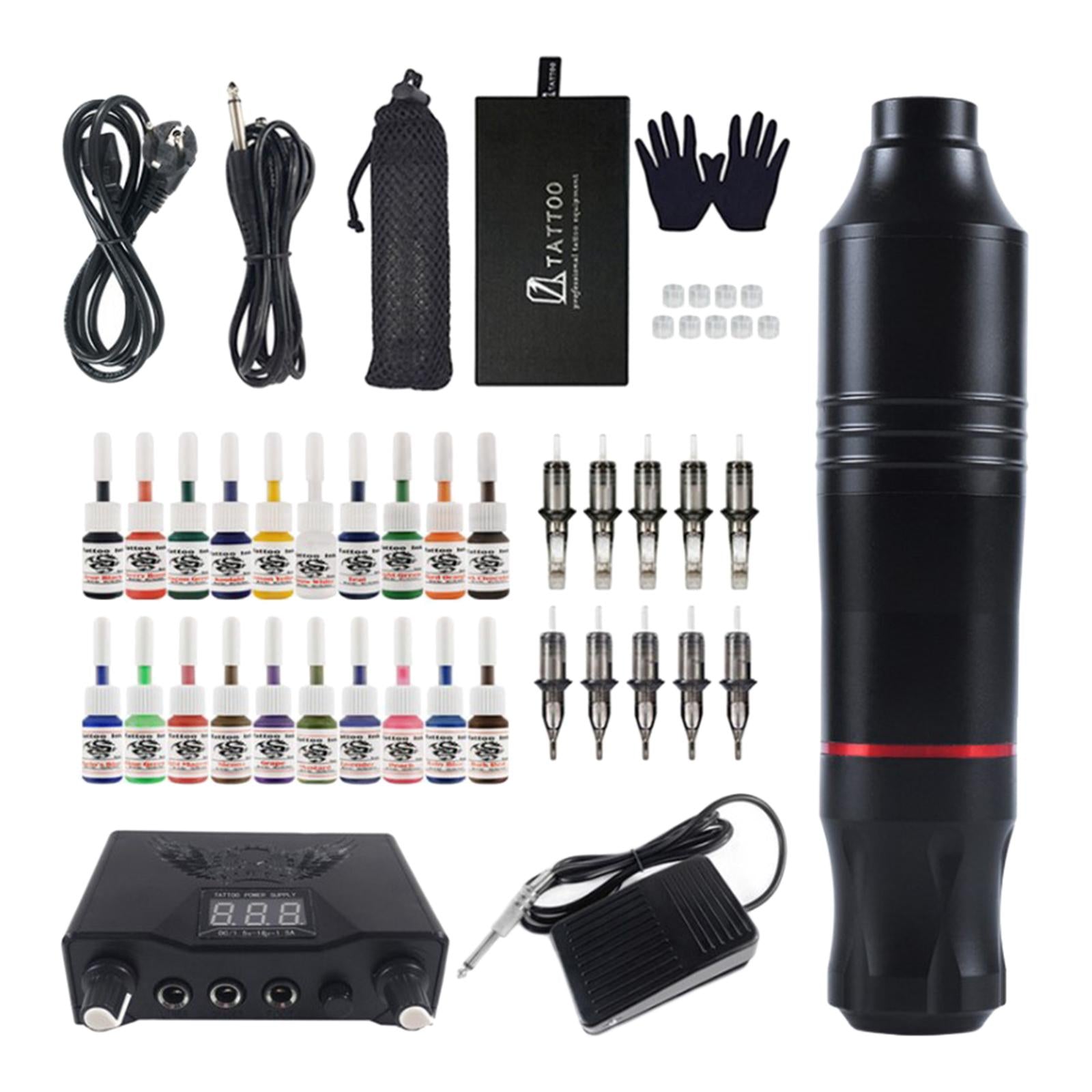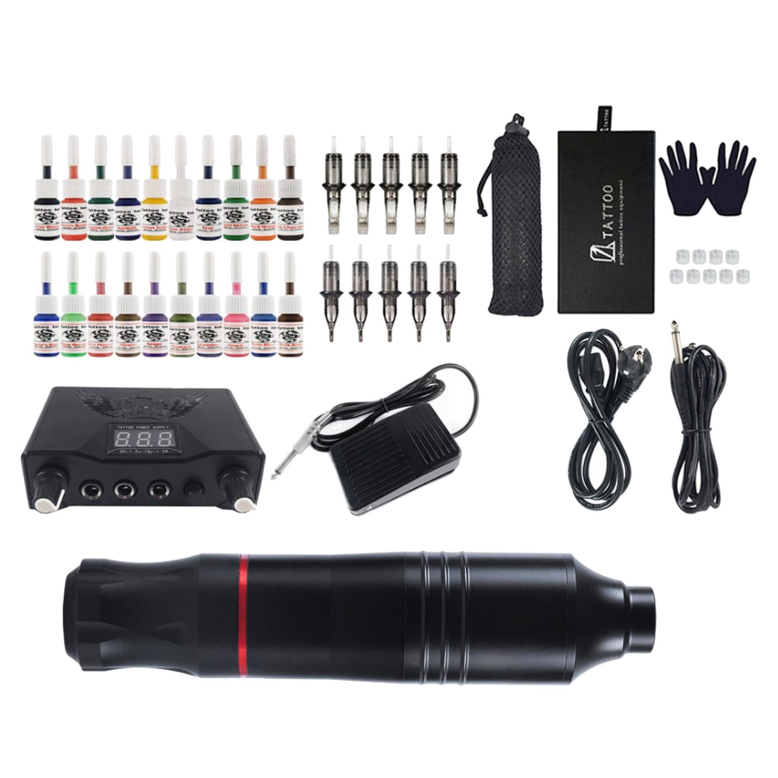 Tattoo Kit: Including 1X rotating pen with DC cable, 1X power supply with cable, 10X cartridge needle mix, 1X foot pedal , 2X rubber gloves, black 1X Dustproof bag, 20X tattoo ink