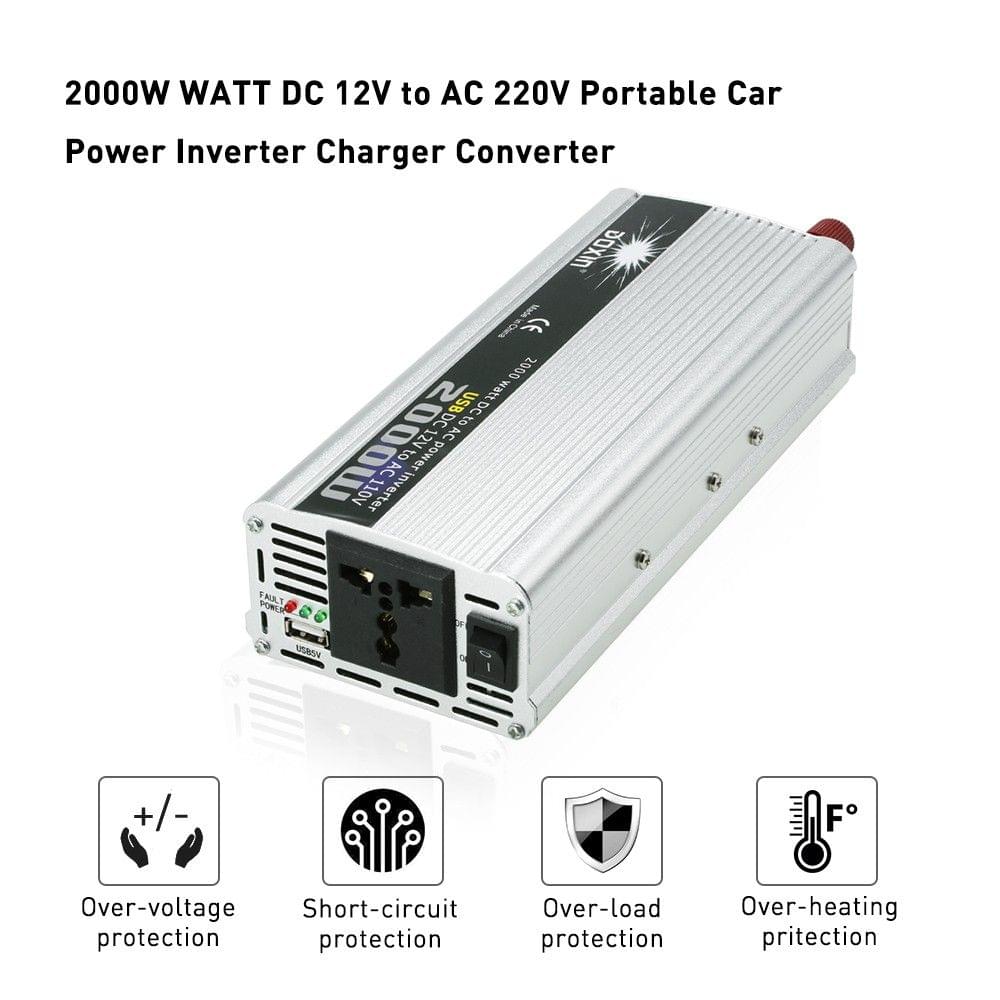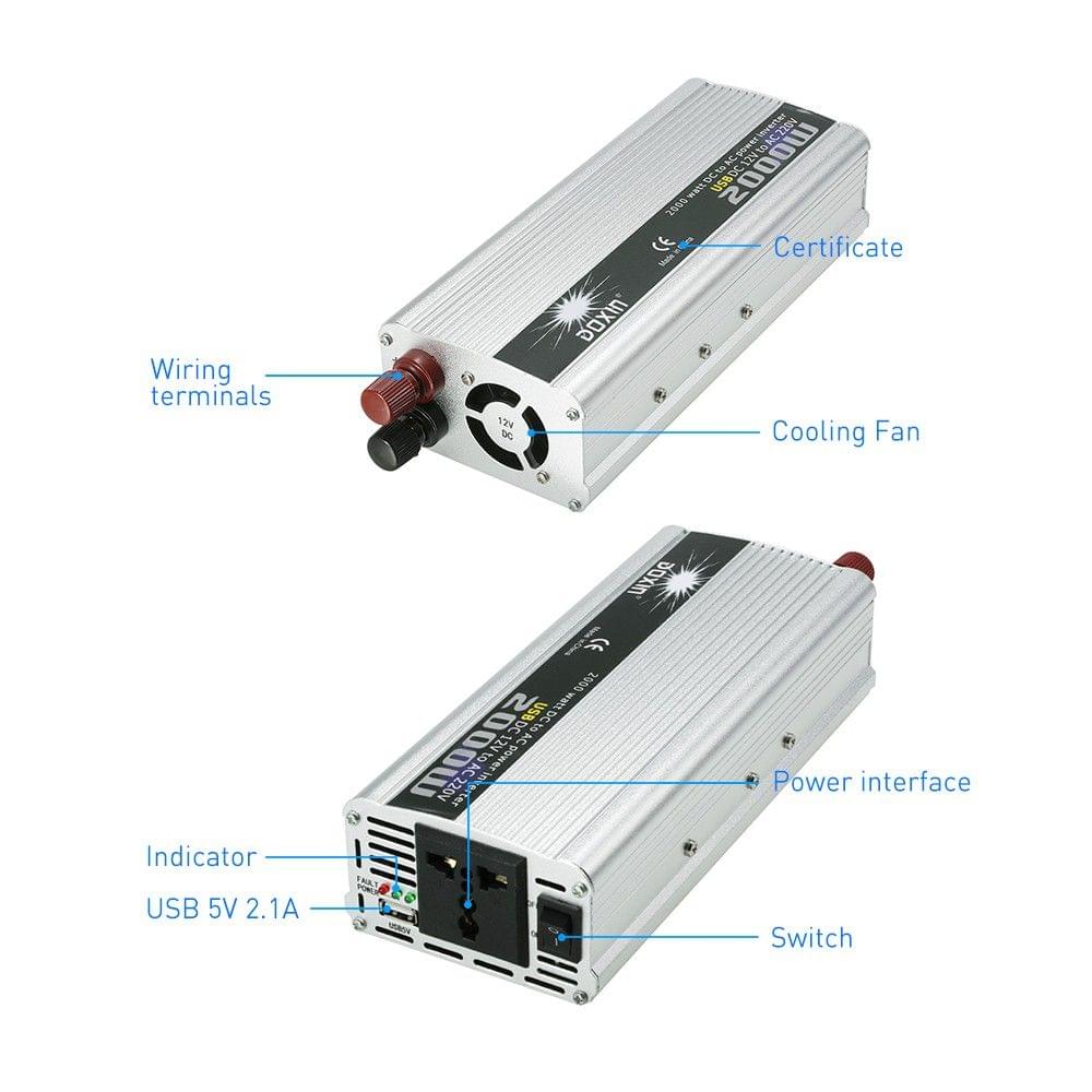 description":"Features: 2000W car power inverter, convert DC 12V to AC 220V. Perfect for in-car use, powers up notebook/laptop, DVD player, digital camera, etc. Steady and precise output voltage. Over temperature protection, overload protection, over voltage protection. Audio alarm of low battery level prior to auto shut down. Built-in cooling fan with low noise. Specifications: Input voltage: DC 12V Output voltage: AC 220V 50 Hz Start peak power: 2000W Continuous power: 850W USB output: 5V 2.1A Peak efficiency: >90% Working temperature: 0~40 degree centigrade Item size: Approx. 21.5 * 9.5 * 5.5cm / 8.5 * 3.7 * 2.2in Item weight: 723g / 1.6lb Package size: Approx. 28 * 24 * 6cm / 11 * 9.4 * 2.4in Package weight: 975g / 2.1lb Package List: 1 * Power Inverter 1 * Cigarette Plug Cable 1 * Battery Clip Cable 1 * Manual (Multi-language)