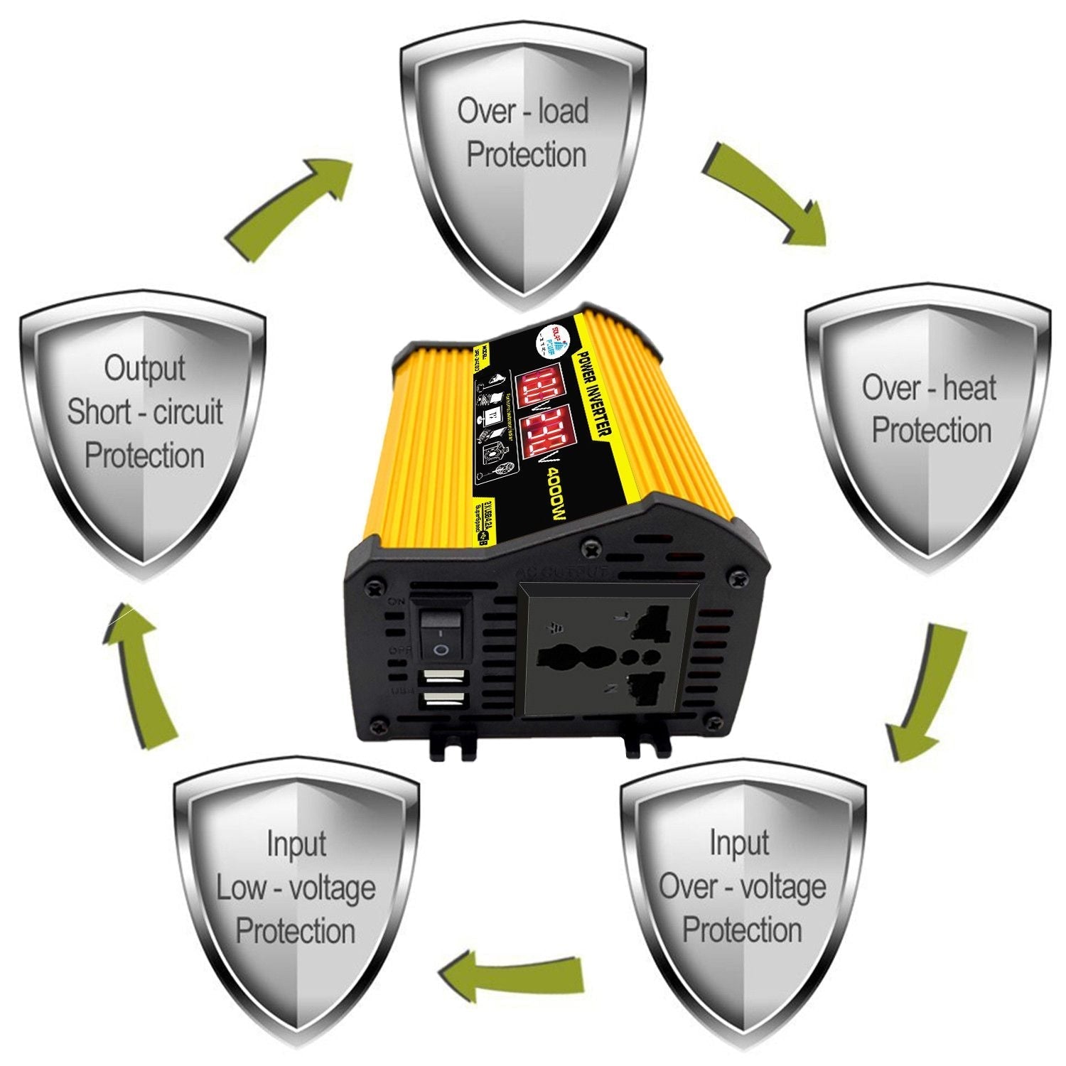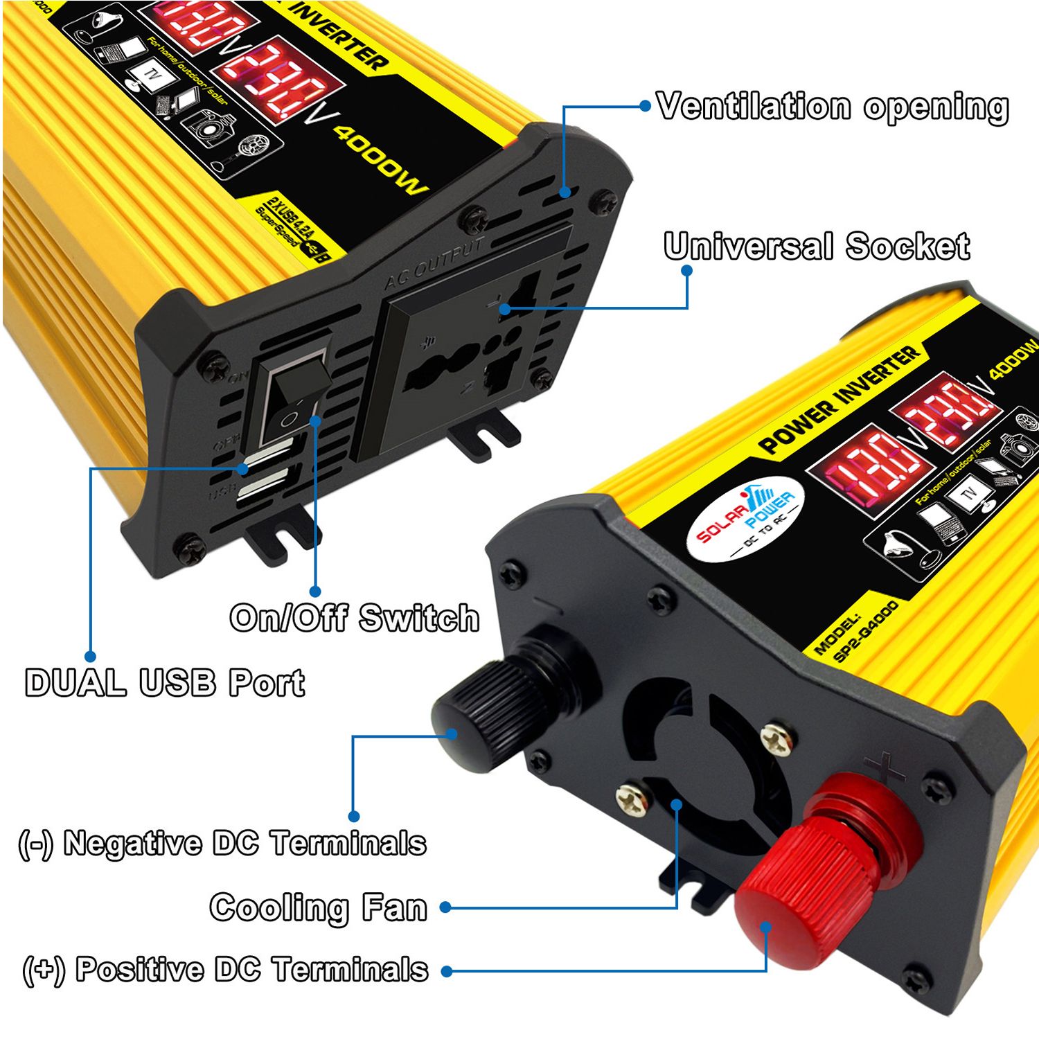 [Surge Peak Power]LED Display shows the battery Input voltage output voltage. DC to AC car power inverter provides 4000 watts DC to AC peak power.