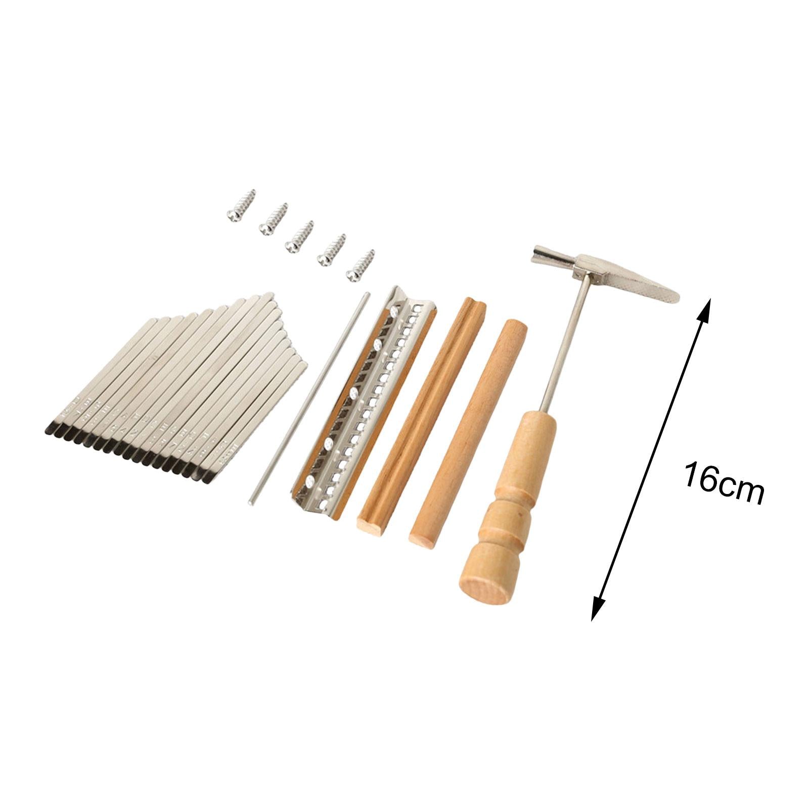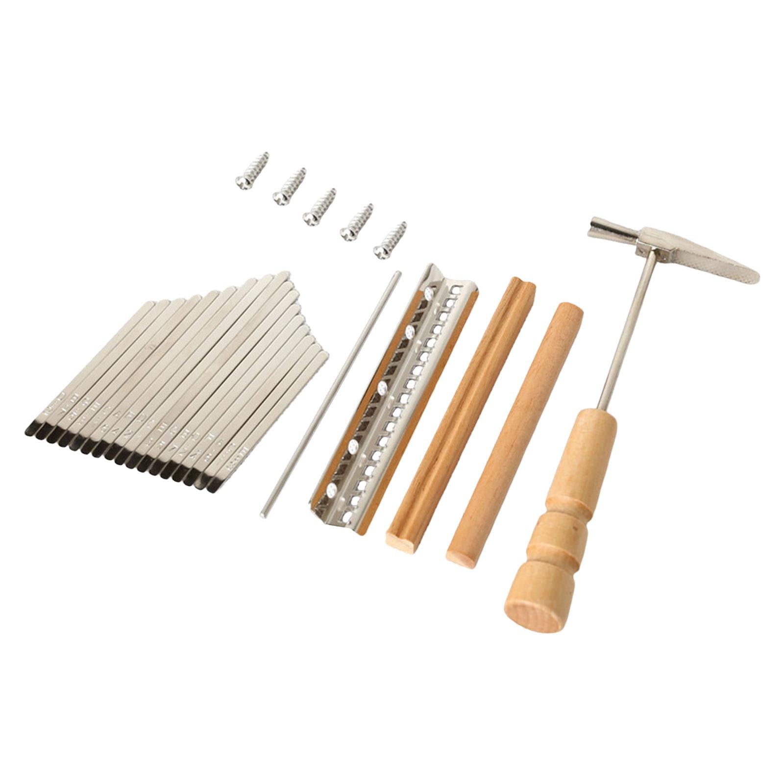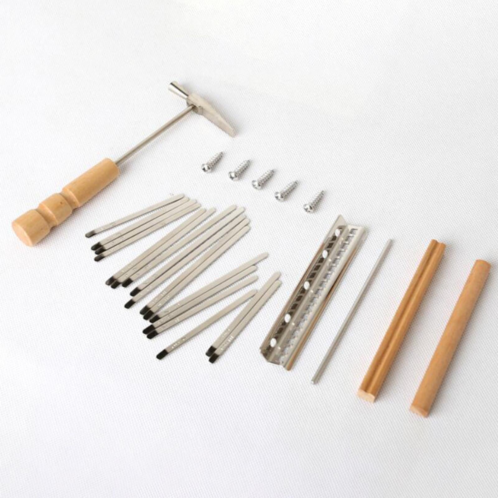 Package Contains: 17 keys, 1 saddle, 1 metal bridge, 5 screw, 1 tuning tool, 2 sleeper