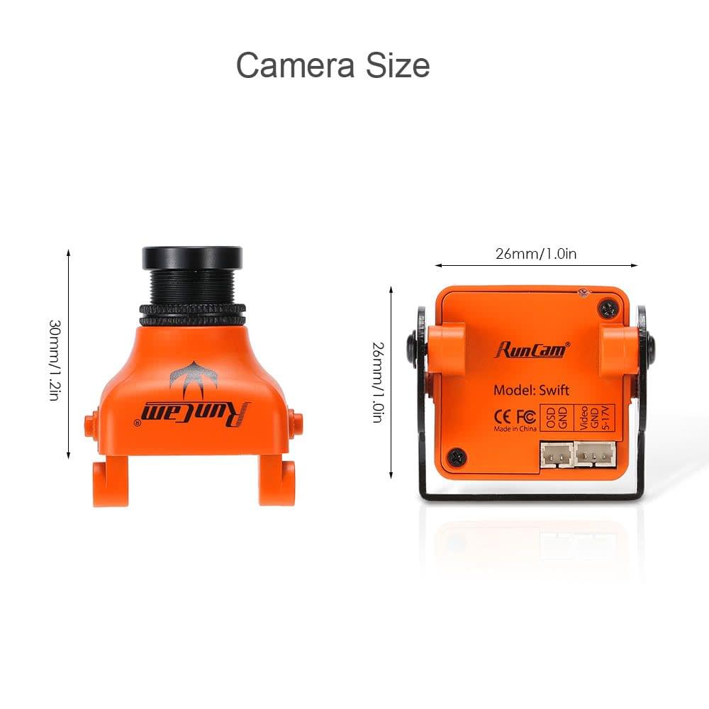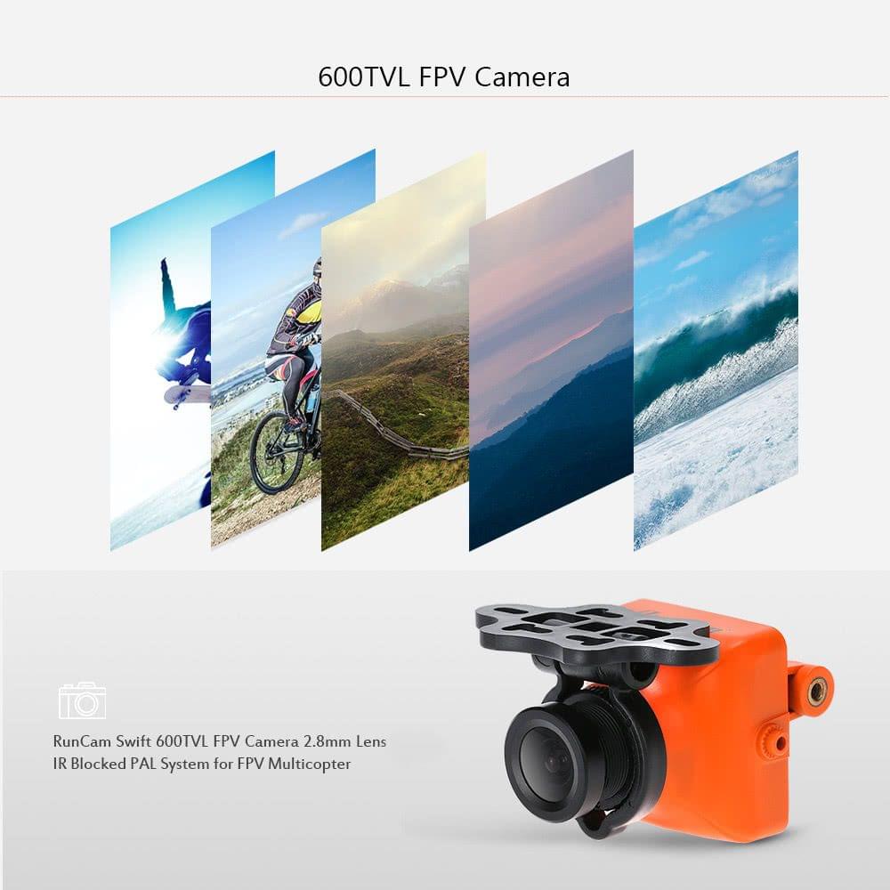 description":"The RunCam Swift 600TVL FPV camera equipped with PAL system, 2.8mm Lens and base holder. Lower power and light weight make this camera a perfect choice for your smaller aircraft. Features: New and high quality Mini small size, easy to use, easy to install Advanced image sensor, great video quality 600TVL horizontal resolution 2.8mm lens optional Only weight 12g (with case) Support 2S, 3S, 4S battery (DC 5 to 17V) wide voltage power input Mini size can reduce air resistance for FPV aircraft Specifications: Brand: Runcam Model: Swift Color: silver/orange/black optional Image Sensor: 1/3 SONY SUPER HAD II CCD Horizontal Resolution: 600TVL Lens: 2.8mm Signal System: PAL OSD Set: Yes S/N Ration: >60dB(AGC OFF) Electronic Shutter Speed: PAL:1/50-100,000 NTSC:1/60-100,000 Auto Gain Control(AGC): Yes Back light compensation(BLC): Yes Min.lllumination: 0.01LuX/1.2F WDR: D-WDR DNR: 2DNR Day/Night: Auto/Color/B&W Power : DC 5 to 17V Item size: 30 * 26 * 26mm (deviation due to manual measurement) Item weight: 12g Package Information: Package size: 9.5 * 7.5 * 6cm / 3.7 * 3.0 * 2.4in Package weight: 139g / 4.9oz General box package Package List: 1 * RunCam Swift Camera 1 * Base Bracket 1 * Hanging Bracket 1 * Back Cover 1 * RCA Video Power Cable 1 * FPV Silicone Cable 1 * 5D-OSD Cable 1 * User Manual