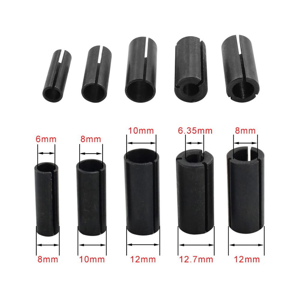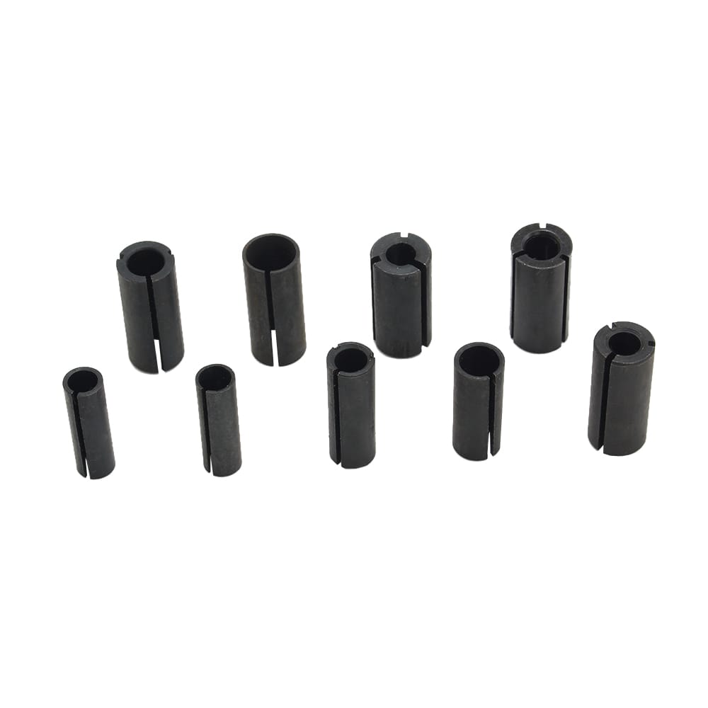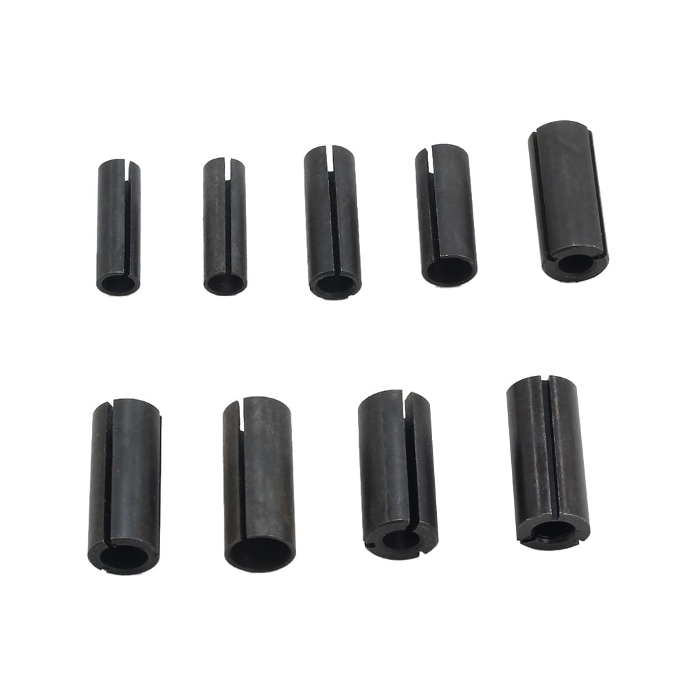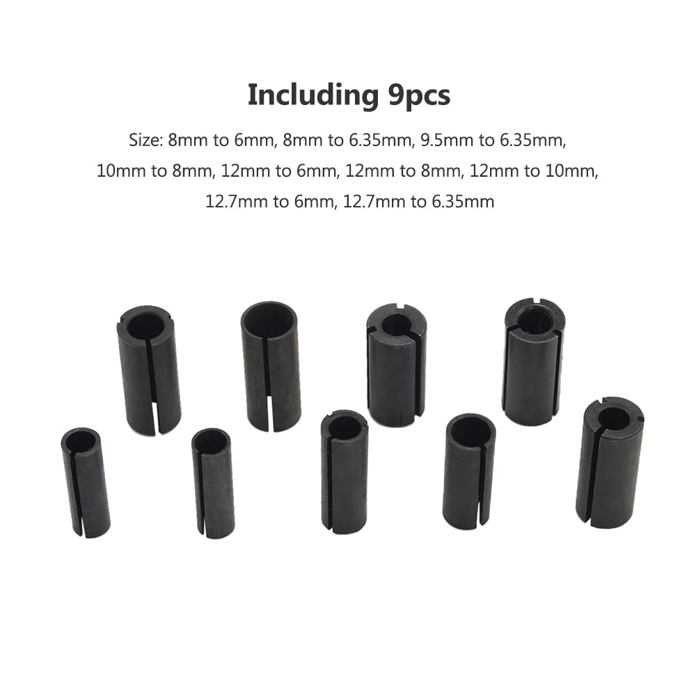 Features:9pcs milling cutter conversion chuck in various size which are applicable to different bit tool and chuck.High-quality carbon steel material durable and wear resistant.Easy to use just slide it into your current collet and tighten as usual.Suitable for engraving machine wood router. A perfect woodworking tool.Sizes: 8mm to 6mm 8mm to 6.35mm 9.5mm to 6.35mm 10mm to 8mm 12mm to 6mm 12mm to 8mm 12mm to 10mm 12.7mm to 6mm 12.7mm to 6.35mm.Specifications:Material: Carbon steelOuter Diameter To Inner Diameter:8mm-6mm/0.31-0.24 inch8mm-6.35mm/0.31-0.25 inch9.5mm-6.35mm/0.37-0.25 inch10mm-8mm/0.39-0.31 inch12mm-6mm/0.47-0.24 inch12mm-8mm/0.47-0.31 inch12mm-10mm/0.47-0.39 inch2.7mm-6mm/0.5-0.24 inch12.7mm-6.35mm/0.5-0.25 inchItem Weight: 72g/ 2.5ozPackage Size: 10 * 7 * 1.5cm/ 3.9 * 2.8 * 0.6inPackage Weight: 92g/ 3.2ozPackage List:9 * Conversion Chucks