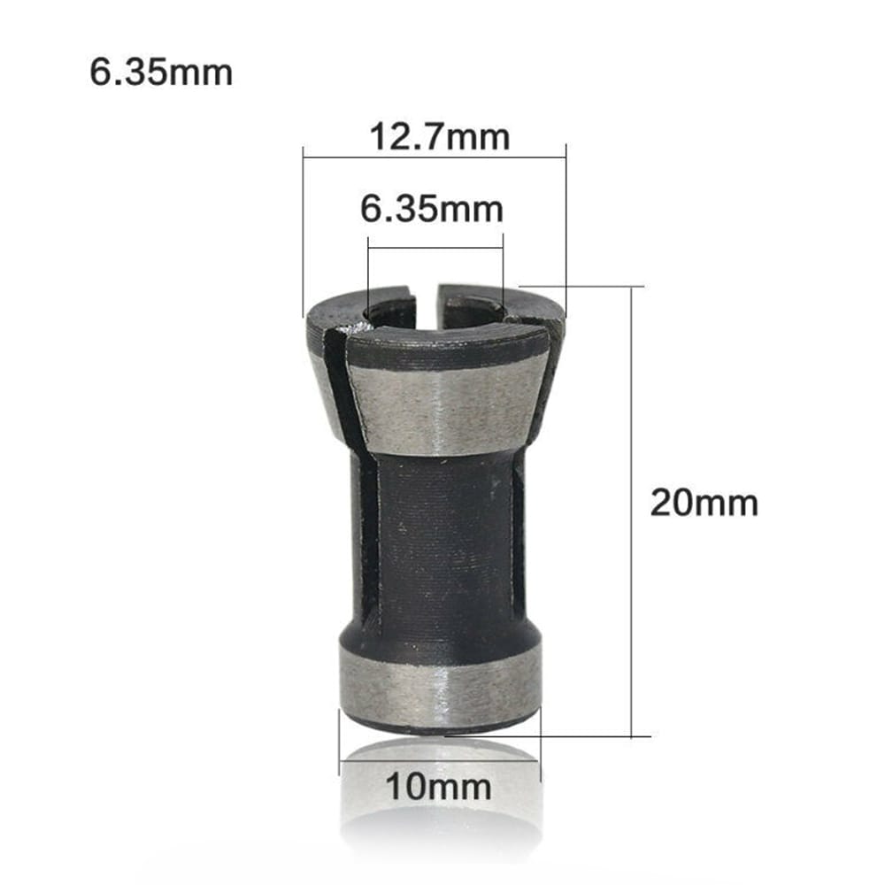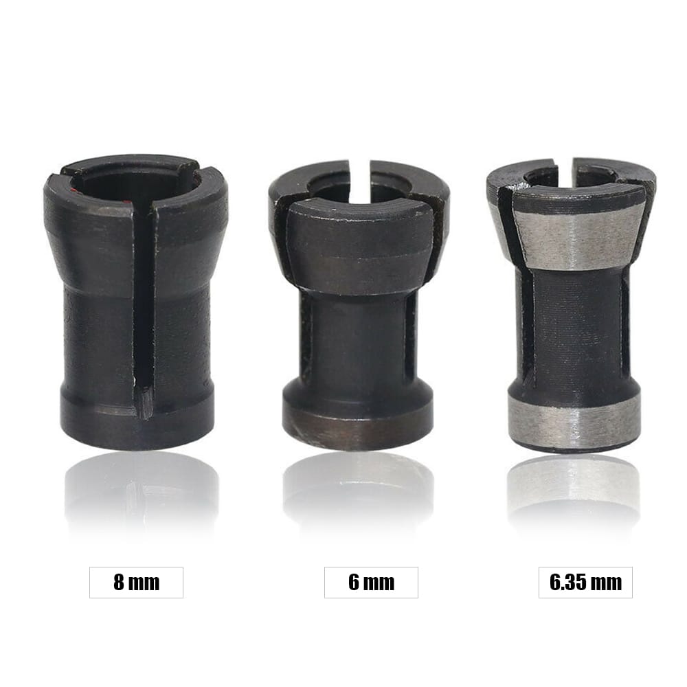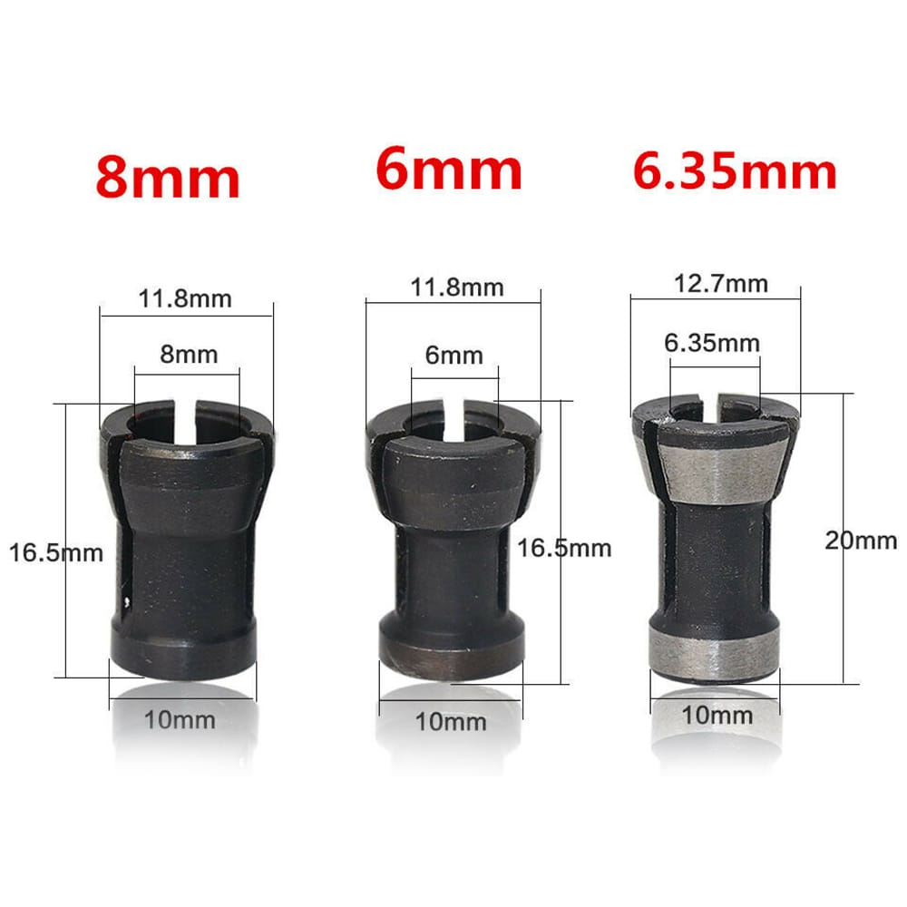 Features:Made from high-quality material.High durability strength and hardness.Easy to use.Supports long time use.Specifications:Material: HSSQuantity: 1pc (8mm / 6mm / 6.35mm) / 1 set (8mm+6mm+6.35mm) (optional)Hole Diameter: 8mm / 6mm / 6.35mm (optional for 1pc)Big H-ead Diameter Outside: 11.8mm / 11.8mm / 12.7mmSmall H-ead Outside Diameter: 10mmOver Length: 16.5mm / 16.5mm / 20mmPackage size: 20 * 20 * 20mm (1pc) 40 * 40 * 30mm (1 set)Package weight: 10g / 0.35ounces (1pc) 30g / 1.06ounces (1 set)Note:1.Due to the different monitor and light effect the actual color of the item might be slightly different from the color showed on the pictures.2.Please allow a little measuring deviation due to manual measurement.Package List:1 * Set of Router Bit Collet