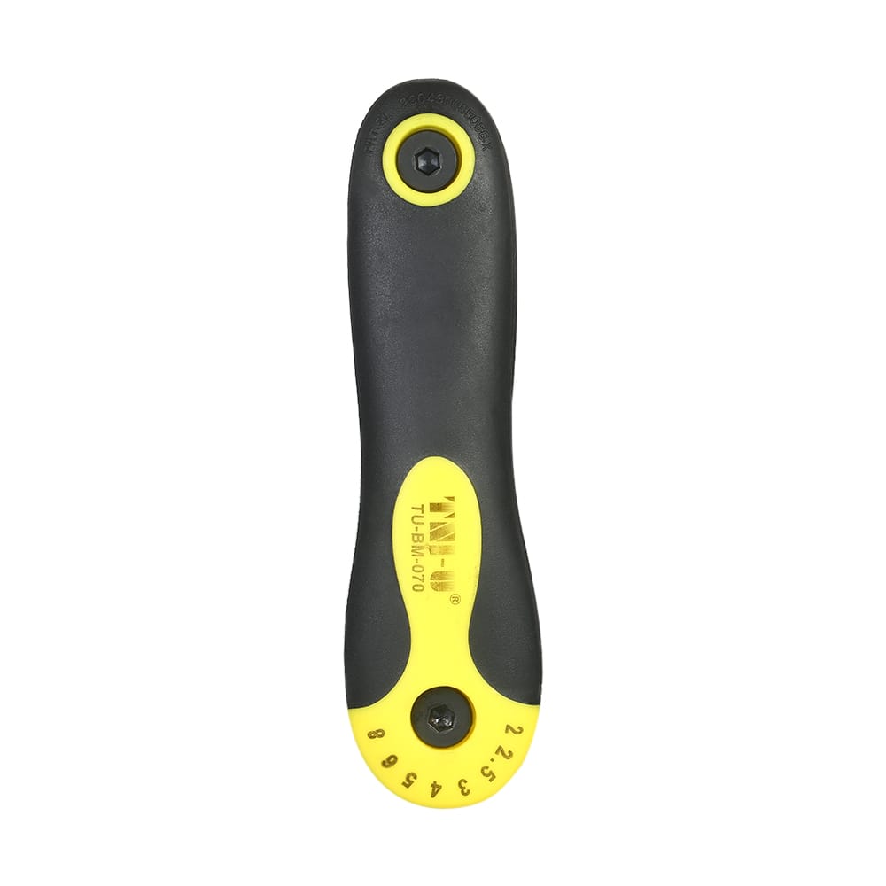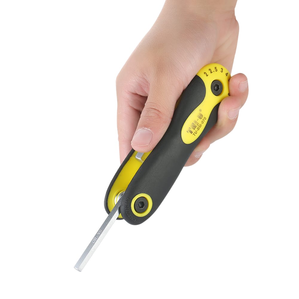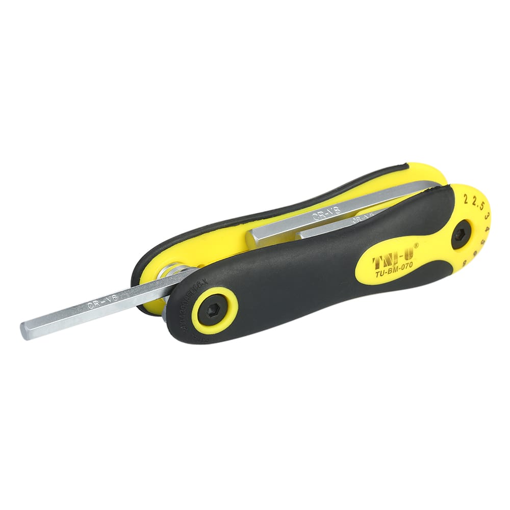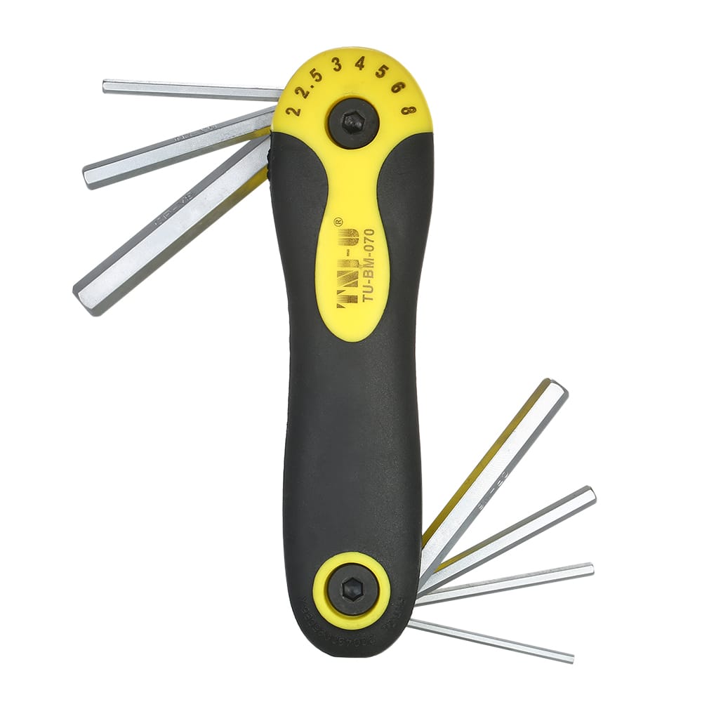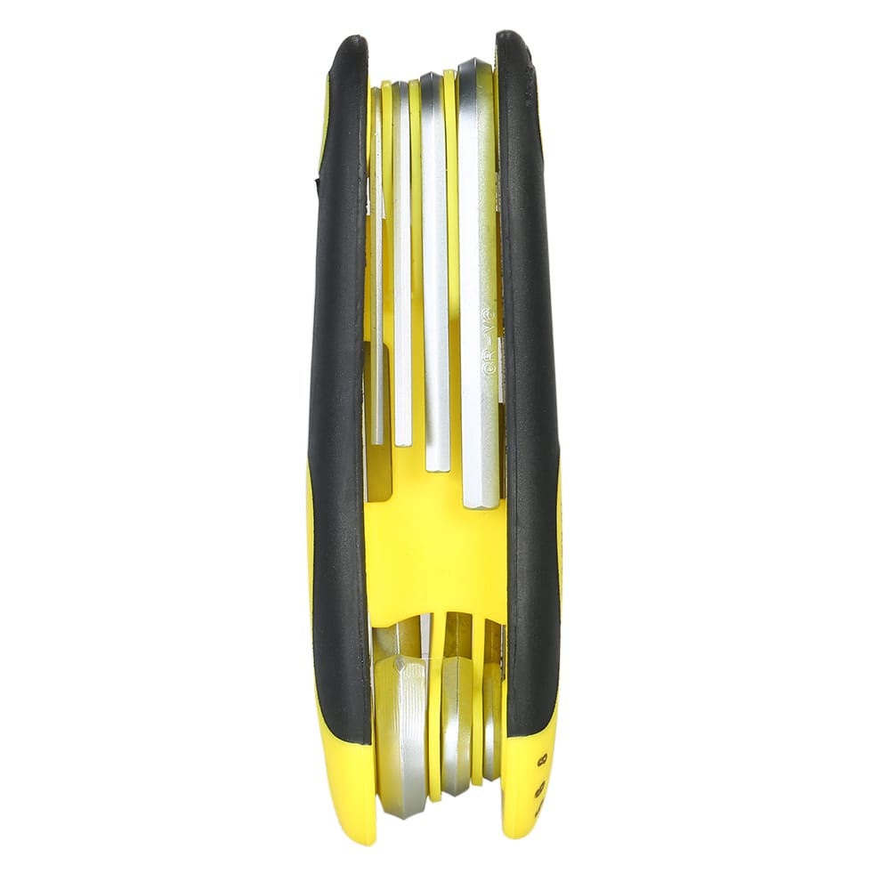 This tool set is lightweight and compact and each tool is folded neatly into the handle for quick and easy access.Features:Quality Tools: Made of chrome-vanadium steel for good durability.Reliable and Efficient: With different sizes a good helper for your repair work.Folding Design: Convenient for storage and carrying anywhere you need.Used to do-it-yourself repairs of electronics bikes appliances and more.Specifications:Color: Black + Silver + YellowMaterial: Chrome-vanadium Steel + PlasticSize: 2.0mm 2.5mm 3.0mm 4.0mm 5.0mm 6.0mm 8.0mmWeight: 176g / 6.23ozPackage Size: 18 * 9 * 3cmPackage Weight: 196g / 6.94ozPackage List:1 * Hex Key Set