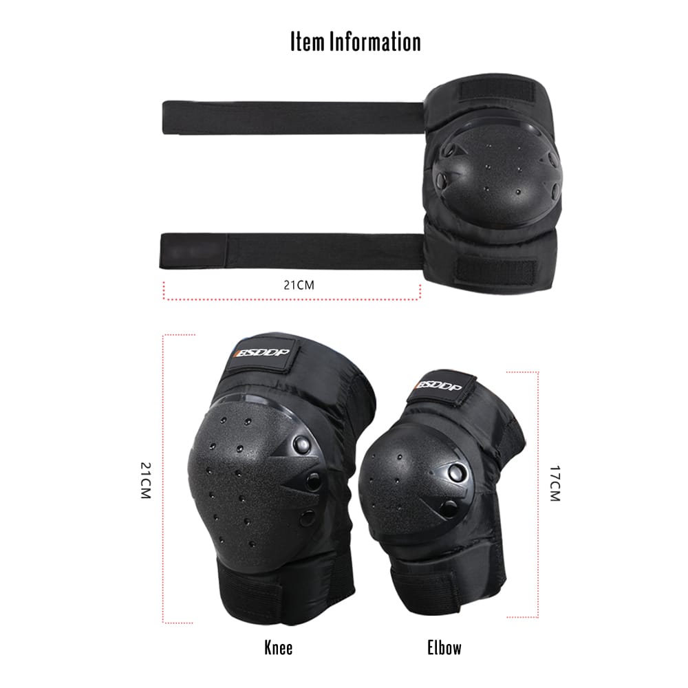 Description4pcs protective pads kit includes 1 pair of knee pads and 1 pair of elbow pads to protect your knees and elbows while you're doing sports. The pads are crafted from soft EVA padding and PE capsid to provide maximum protection against bumps and impacts great for Motorbike/Motocross Cycling Skiing Snowboarding Skateboards.Features:Includes 1 pair of Knee Pads (2 PCS) and 1 Pair of Elbow Pads (2 PCS).Soft EVA padding with numerous air vents provides maximum comfort and ventilation.Tough PE capsid to protect your knees and elbow from bumps and impact.Adjustable elastic quick-release straps for optimum fit and easy removal.Fixed nails keep the pads solid and secure.Great for Motorbike/Motocross Cycling Skiing Snowboarding Skating.Specifications:Condition: NewColor: BlackMaterial: PE Capsid + EVA Foam + Diving Cloth + Elastic BandSize: One size fits mostPackage Weight: 300g/21.3ozPackage Size: 21*15*5cm/8.27*5.9*10.6inchPackage List:2* Knee Pads2* Elbow Pads