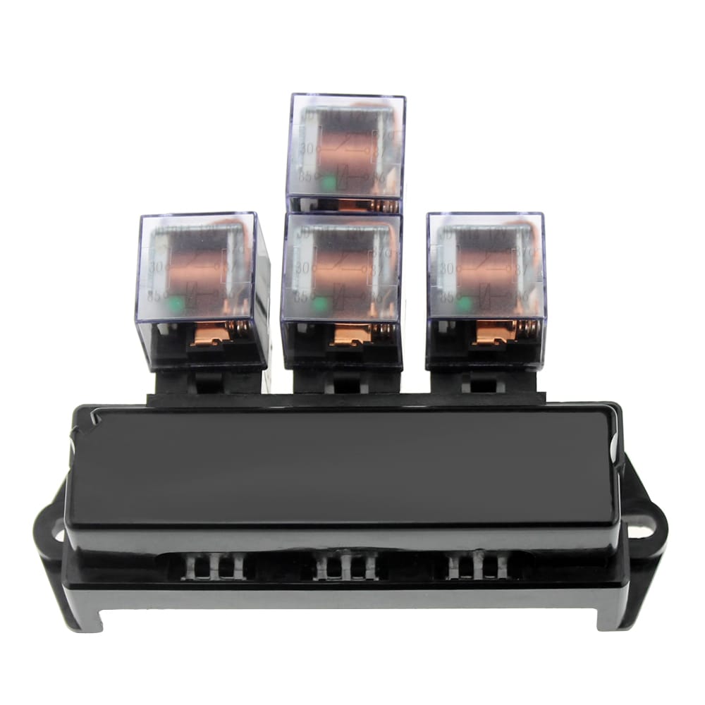 Features:10 way fuse box with 5-pin relay and 13 Pcs standard blade fuses.Universal for Auto car SUV Off-Road pickup truck and so on.10A 25A 20A 15A 35A five kinds of fuses for you to use.Specifications:Material: plastic5-Pin relay:12V 80AFuse: 13pcs standard blade fuses: 10A *2 25A*2 20A*4 15A*3 35A*2Fusecurrent : 1A-40APackage size:24 * 9.7 * 7.8cm / 9.4 * 3.8 * 3inPackage weight:380g / 13.4ozPackage List:1 * Fuse Box4 * 5-pin Relay13 * Standard Blade Fuses20 * Relay TerminalsWiring Connecting:1. Use the terminal to connect the 4 square wire to make the line after inserting the fuse connect the positive pole of the power supply.2. Relays are connected in parallel to ground.3. About relay wiring please refer to the relay wiring diagram.